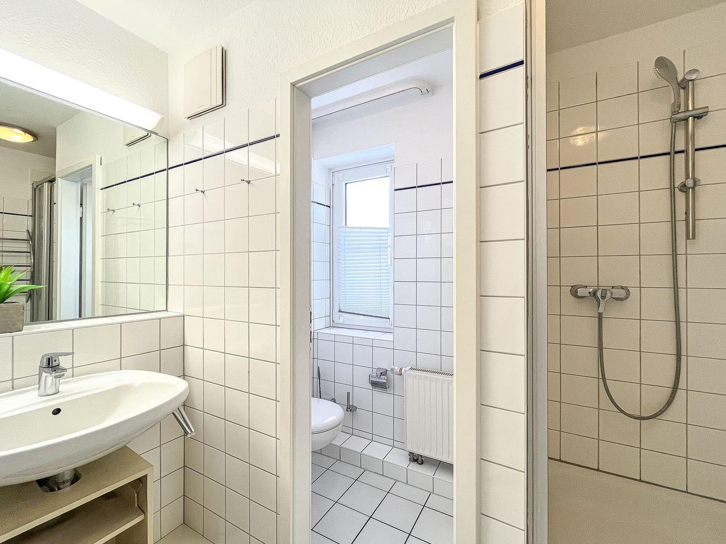 Das Badezimmer ist mit einer Dusche, separatem WC und Waschbecken ausgestattet. Ein Kosmetikspiegel und ein Haartrockner sind ebenfalls vorhanden.