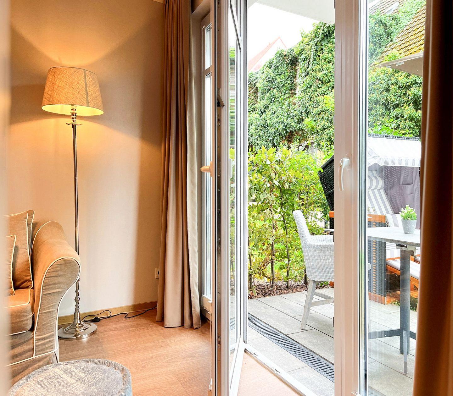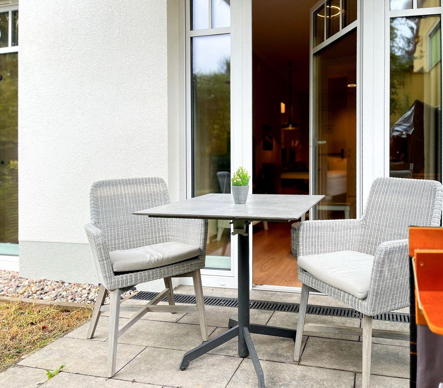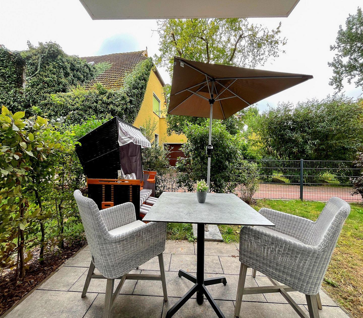 Ein besonderes Highlight ist die möblierte Terrasse mit Gartenblick – perfekt für ein entspanntes Frühstück an der frischen Luft oder ein Glas Wein am Abend.