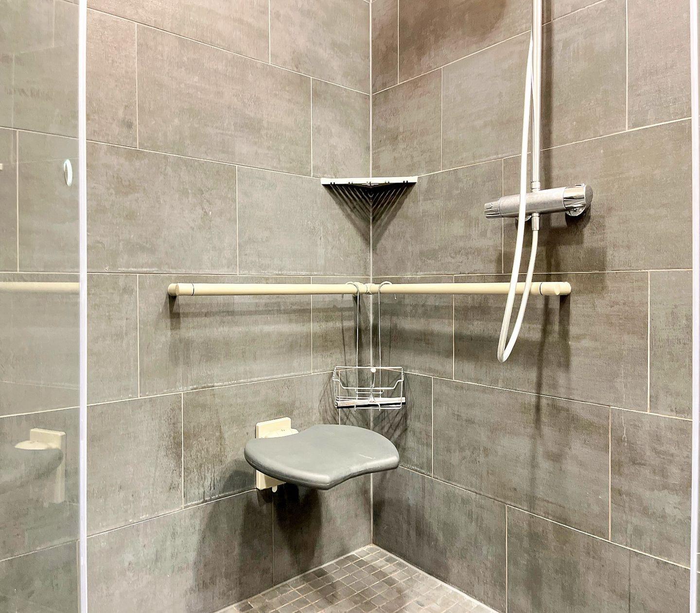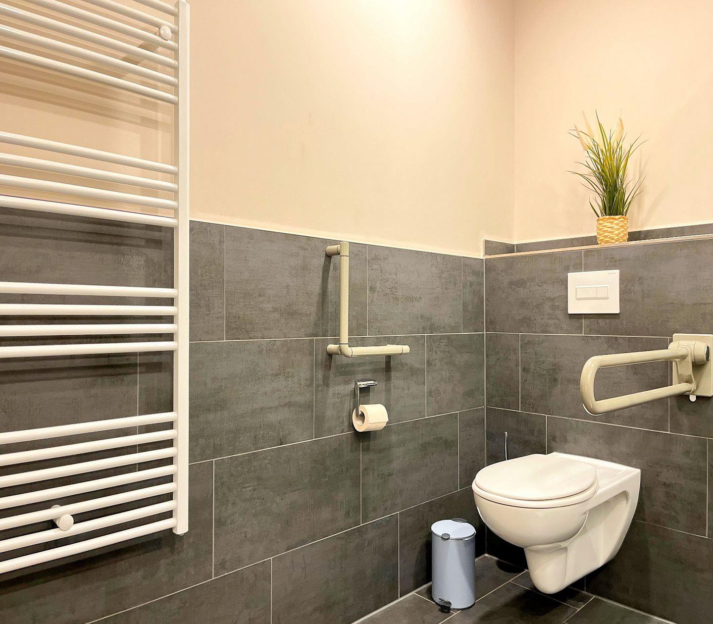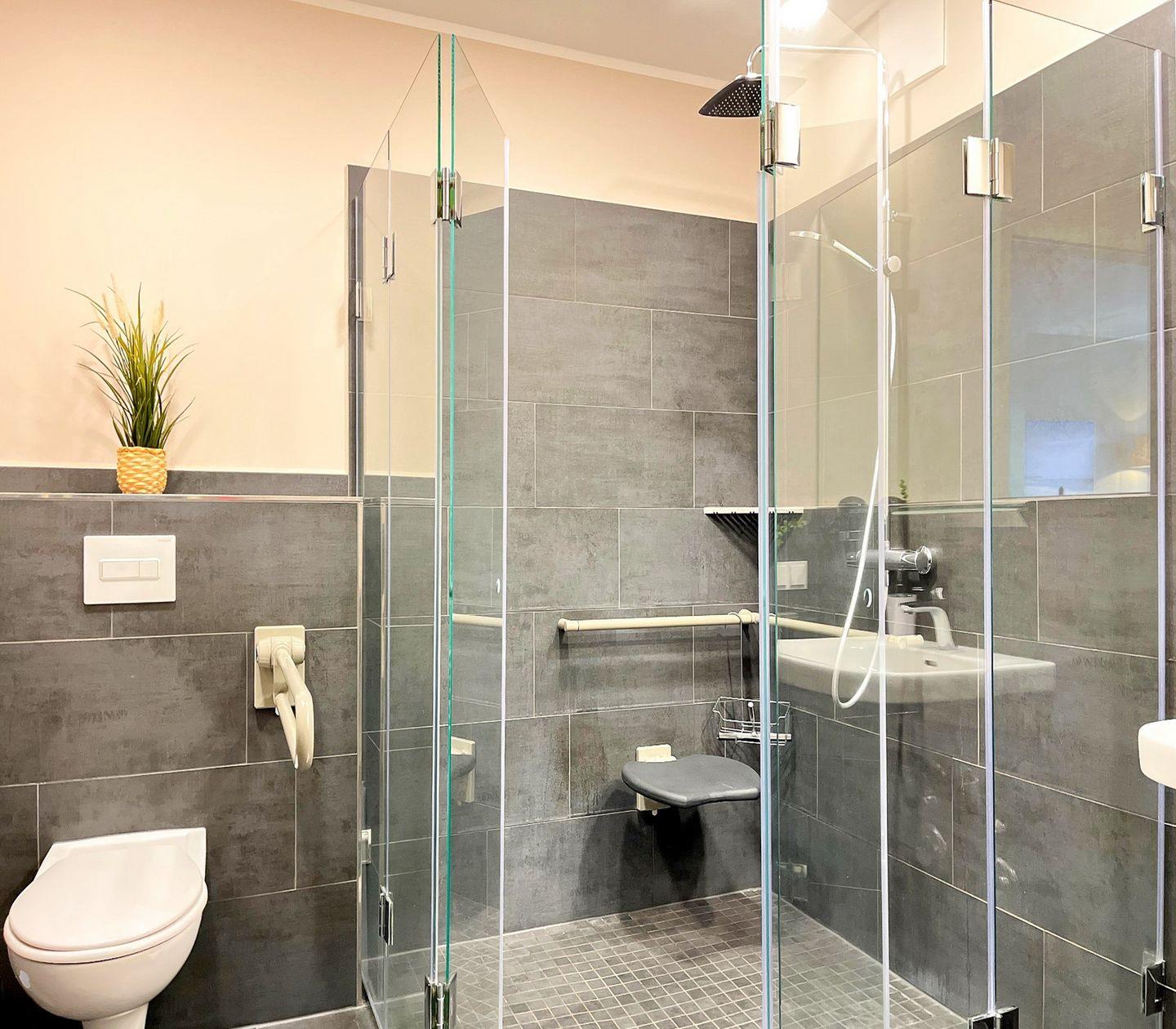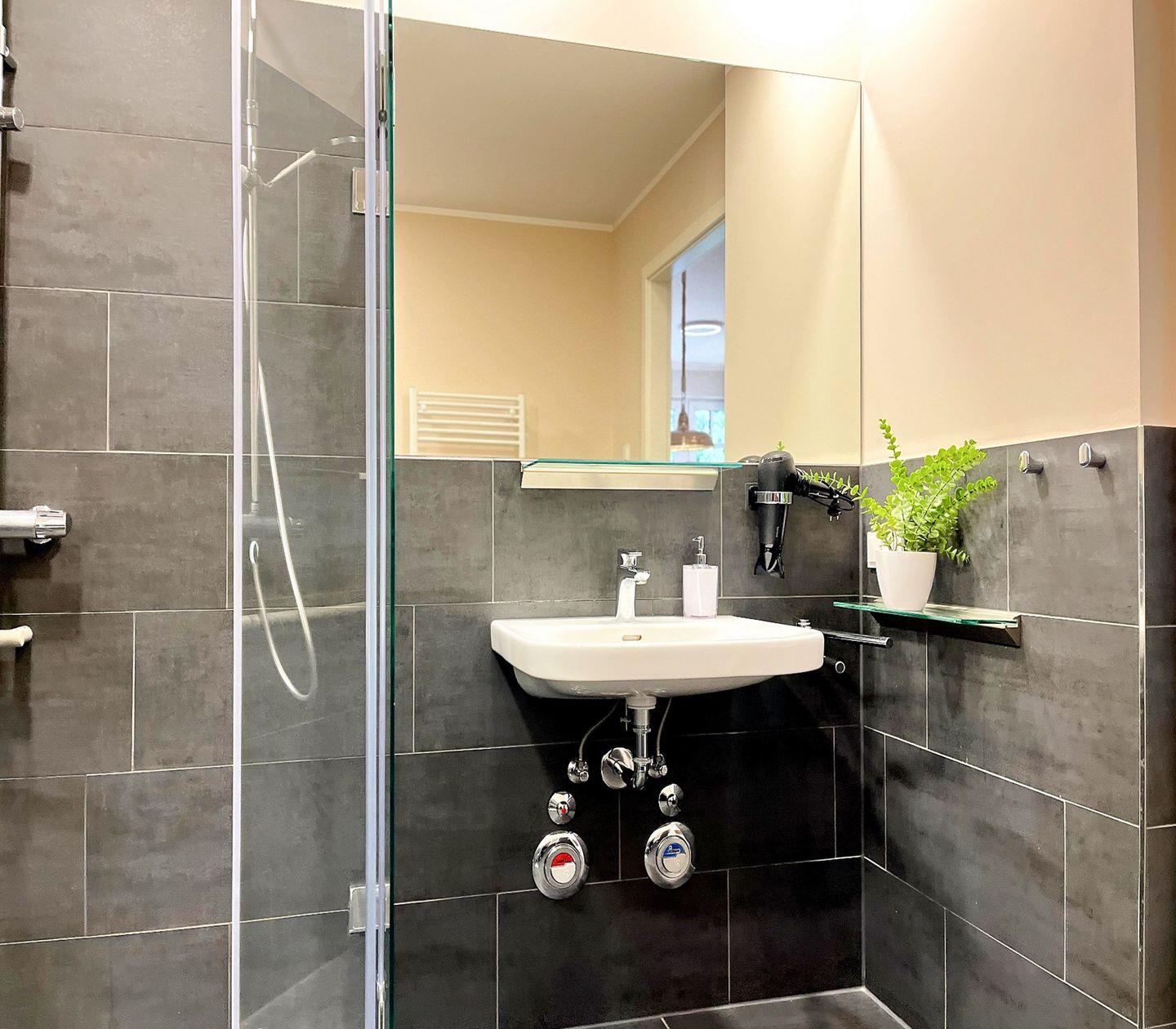 Das moderne Badezimmer verfügt über eine bodengleiche Dusche, WC, Waschbecken, Kosmetikspiegel und Haartrockner – ideal für Deinen Start in den Tag.