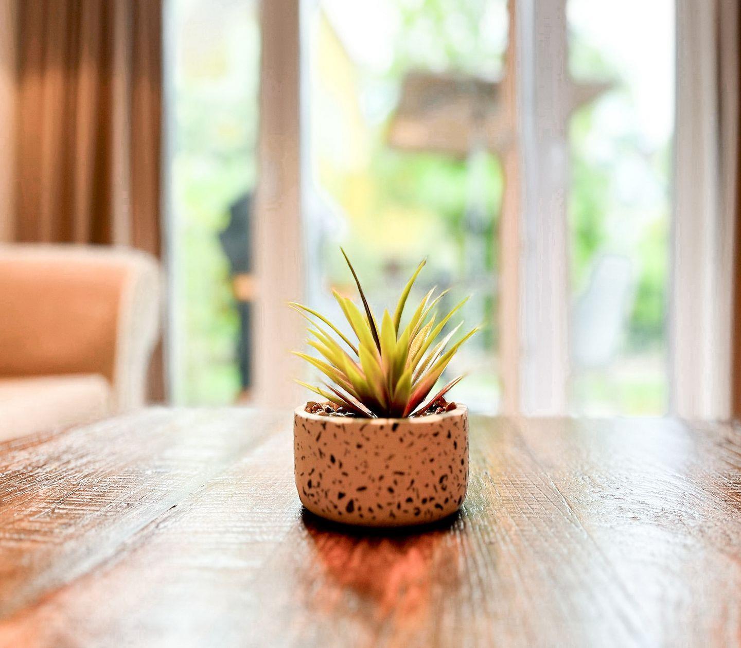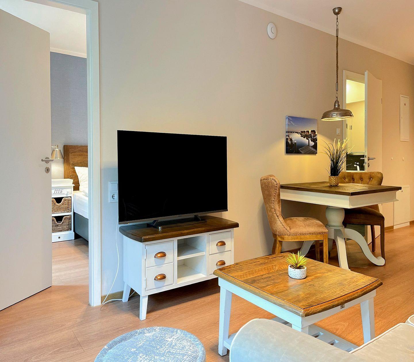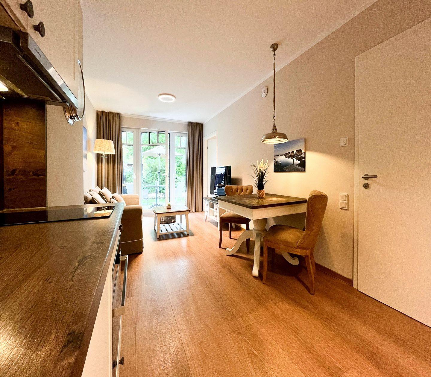Der Wohnbereich lädt mit einem komfortablen Sofa und einem Flachbild-TV zu entspannten Stunden ein. Von hier aus hast Du einen schönen Blick ins Grüne. Der Essbereich bietet Platz für zwei Personen und fügt sich harmonisch in das offene Raumkonzept ein.