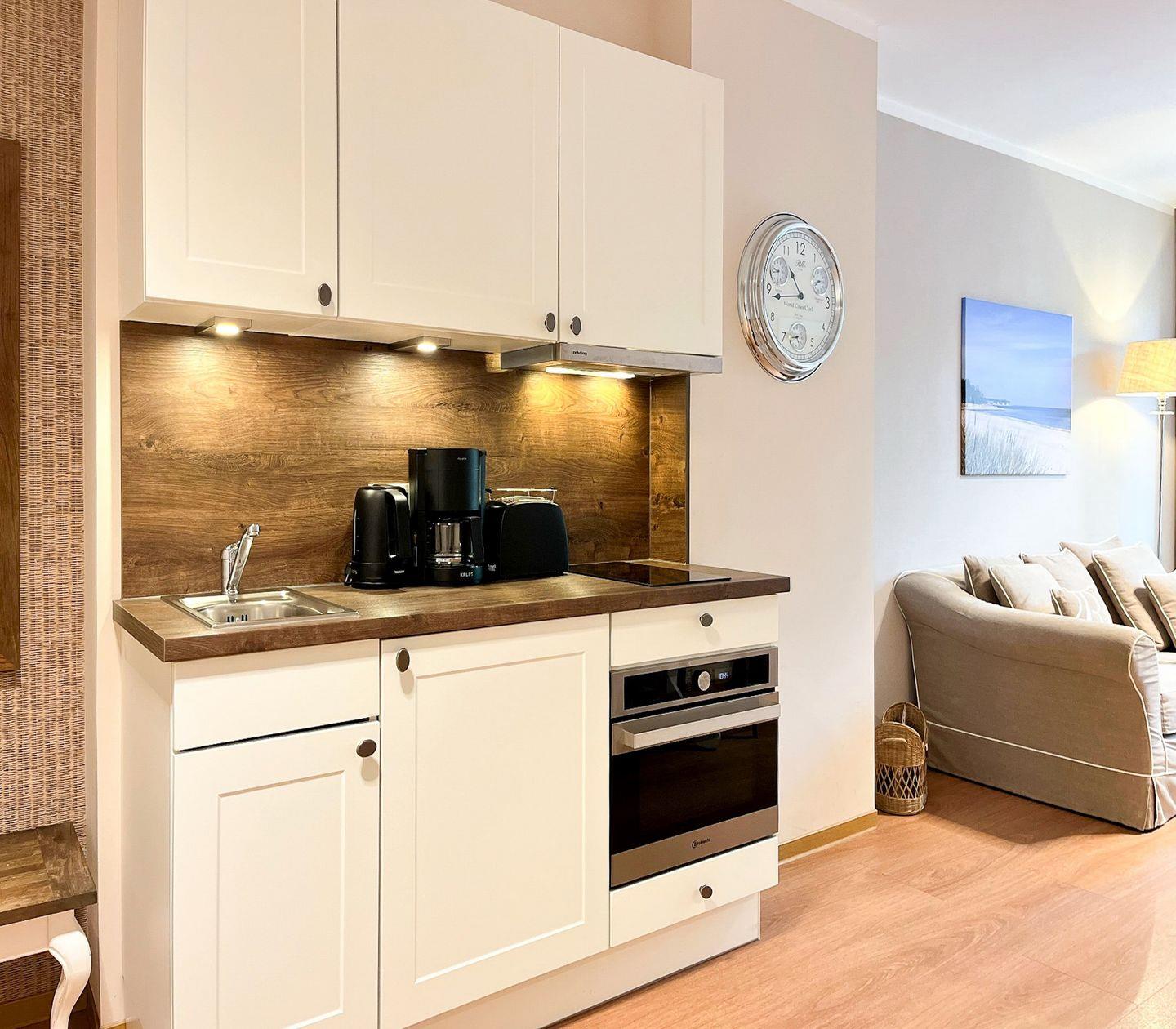 Die Küche ist offen in den Wohnbereich integriert und bestens ausgestattet: Cerankochfeld, Backofen, Kühlschrank mit Gefrierfach, Kaffeemaschine, Wasserkocher, Toaster sowie diverse Kochutensilien und Geschirr lassen keine Wünsche offen – perfekt für die Selbstverpflegung.