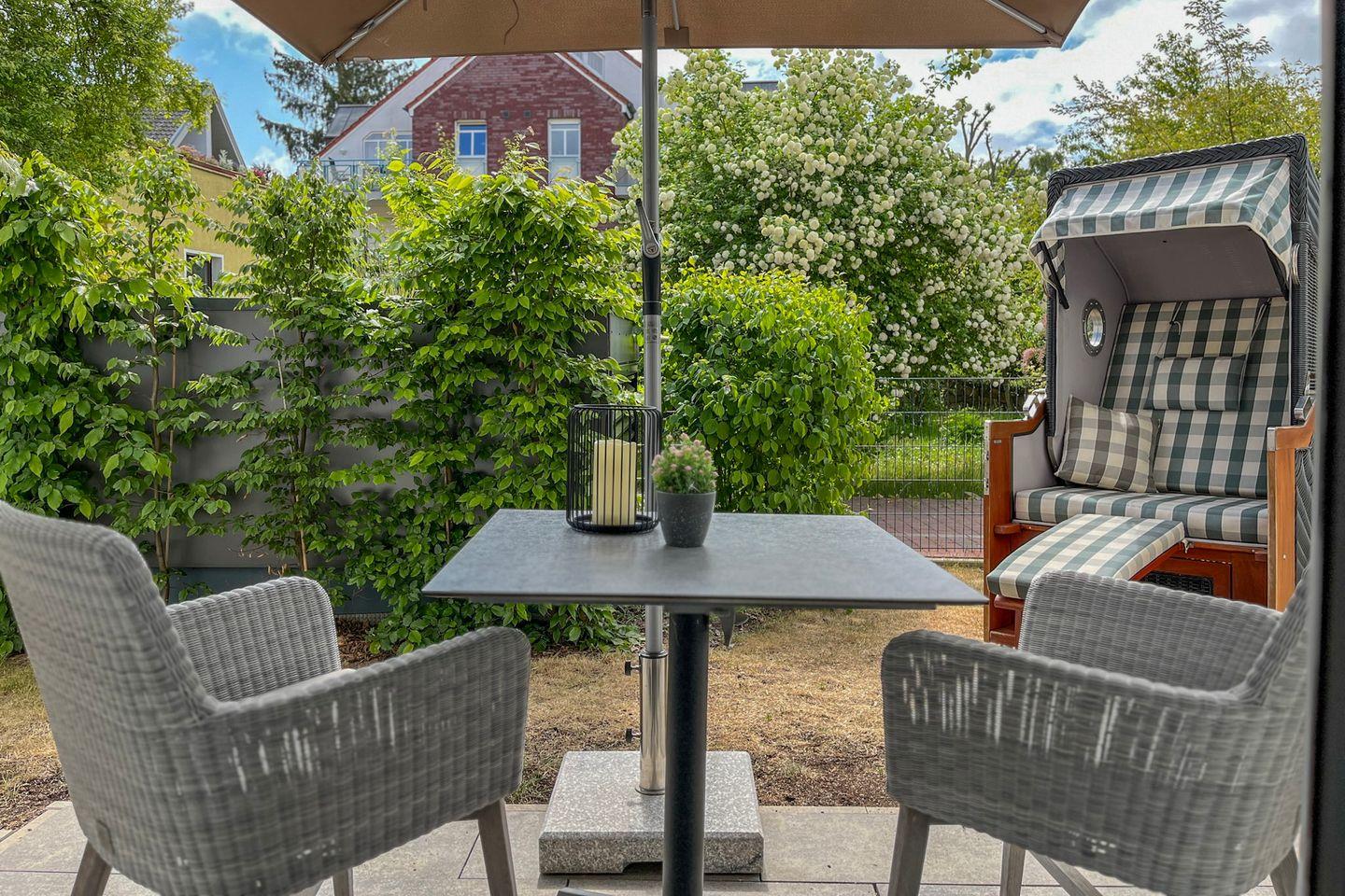 Ein echtes Plus ist die Terrasse mit Gartenmöbeln und Strandkorb – perfekt für ein Frühstück an der frischen Luft oder ruhige Stunden im Freien.