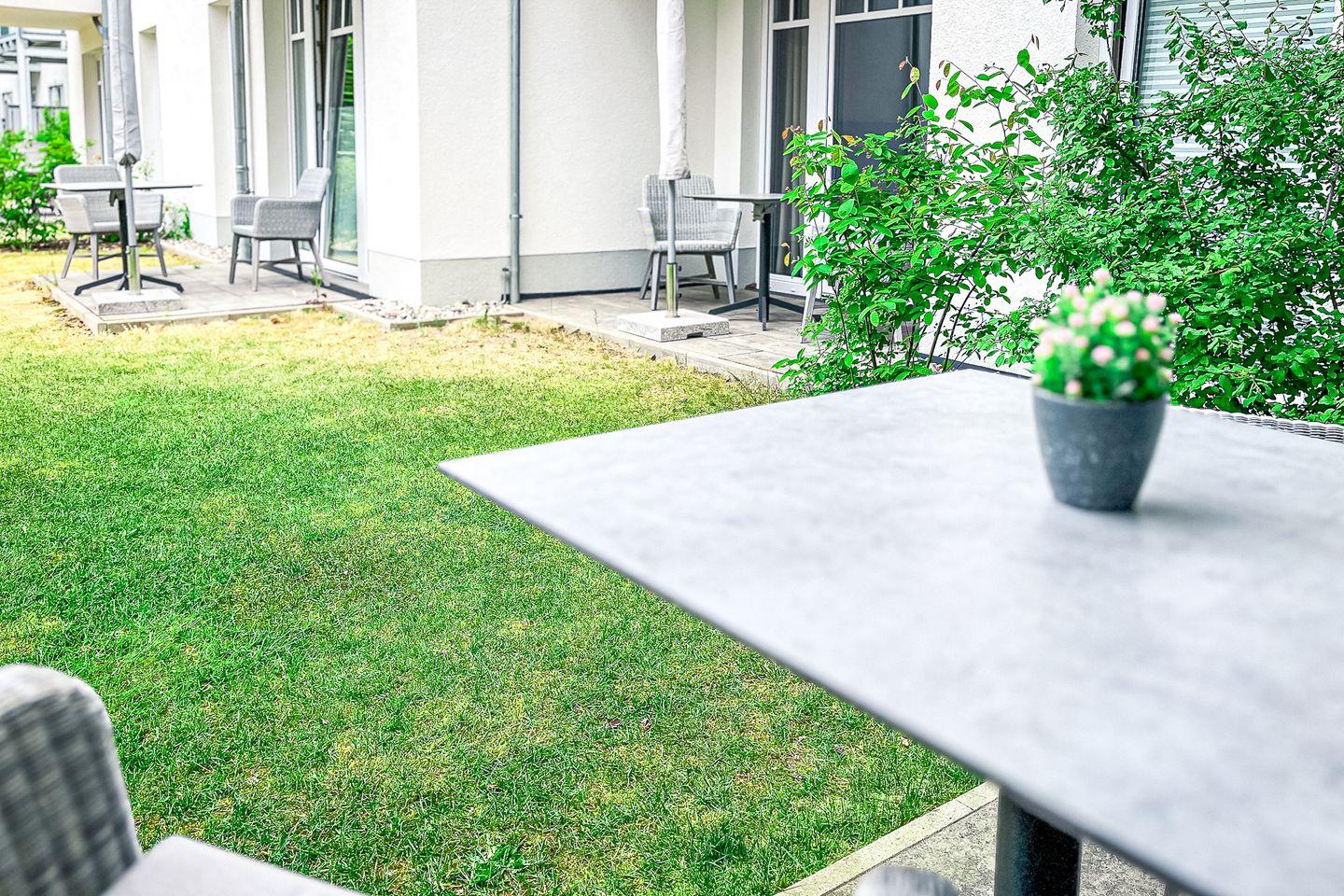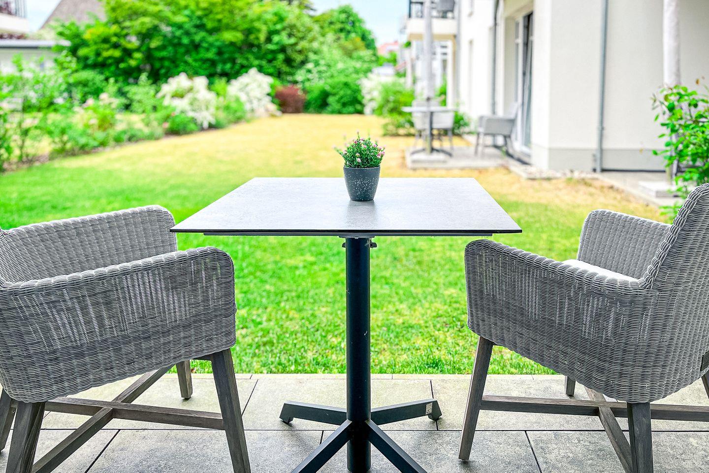 Ein Highlight ist die Terrasse mit Gartenmöbeln – hier kannst Du den Tag bei einem Frühstück im Freien oder einem Buch an der frischen Luft genießen.