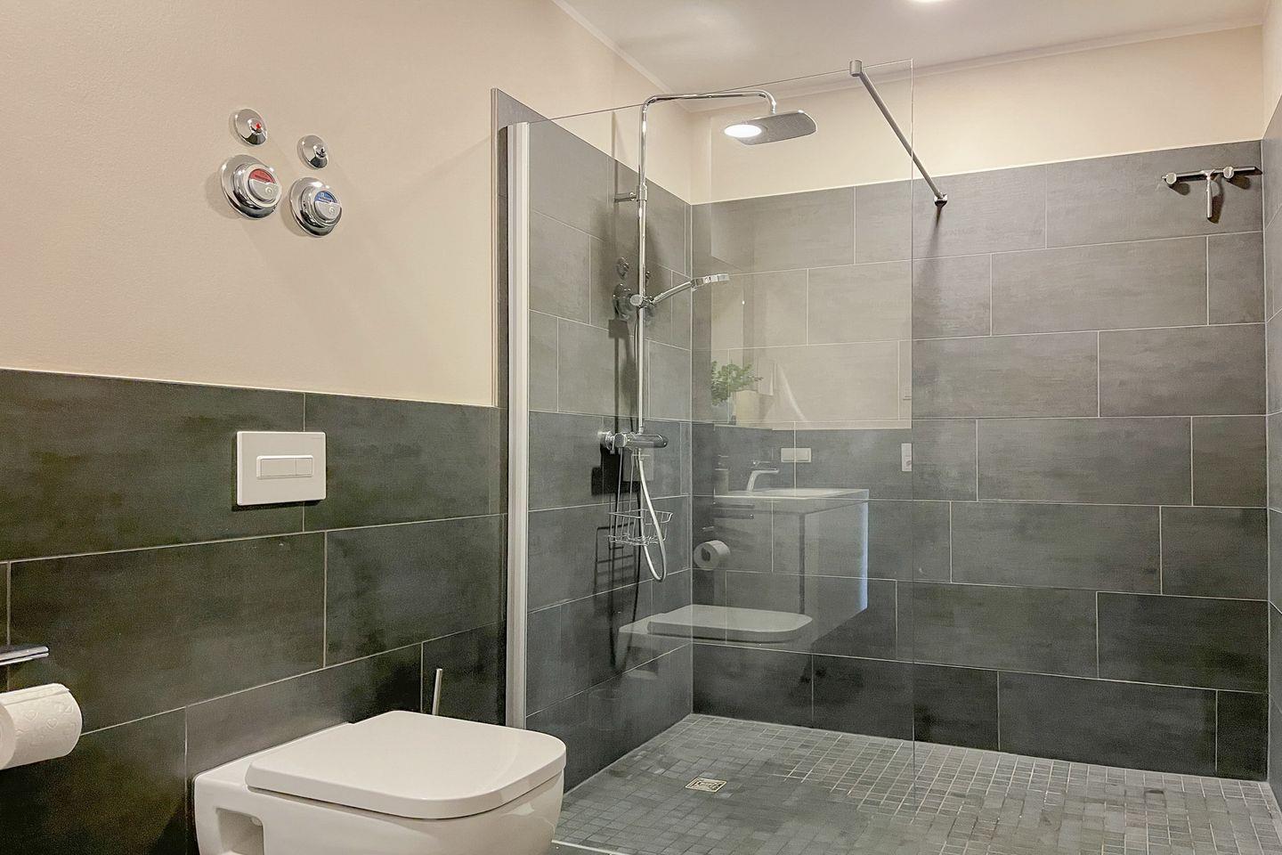 Das moderne Badezimmer ist mit einer bodengleichen Dusche, WC, Waschbecken, Kosmetikspiegel und einem Haartrockner ausgestattet.