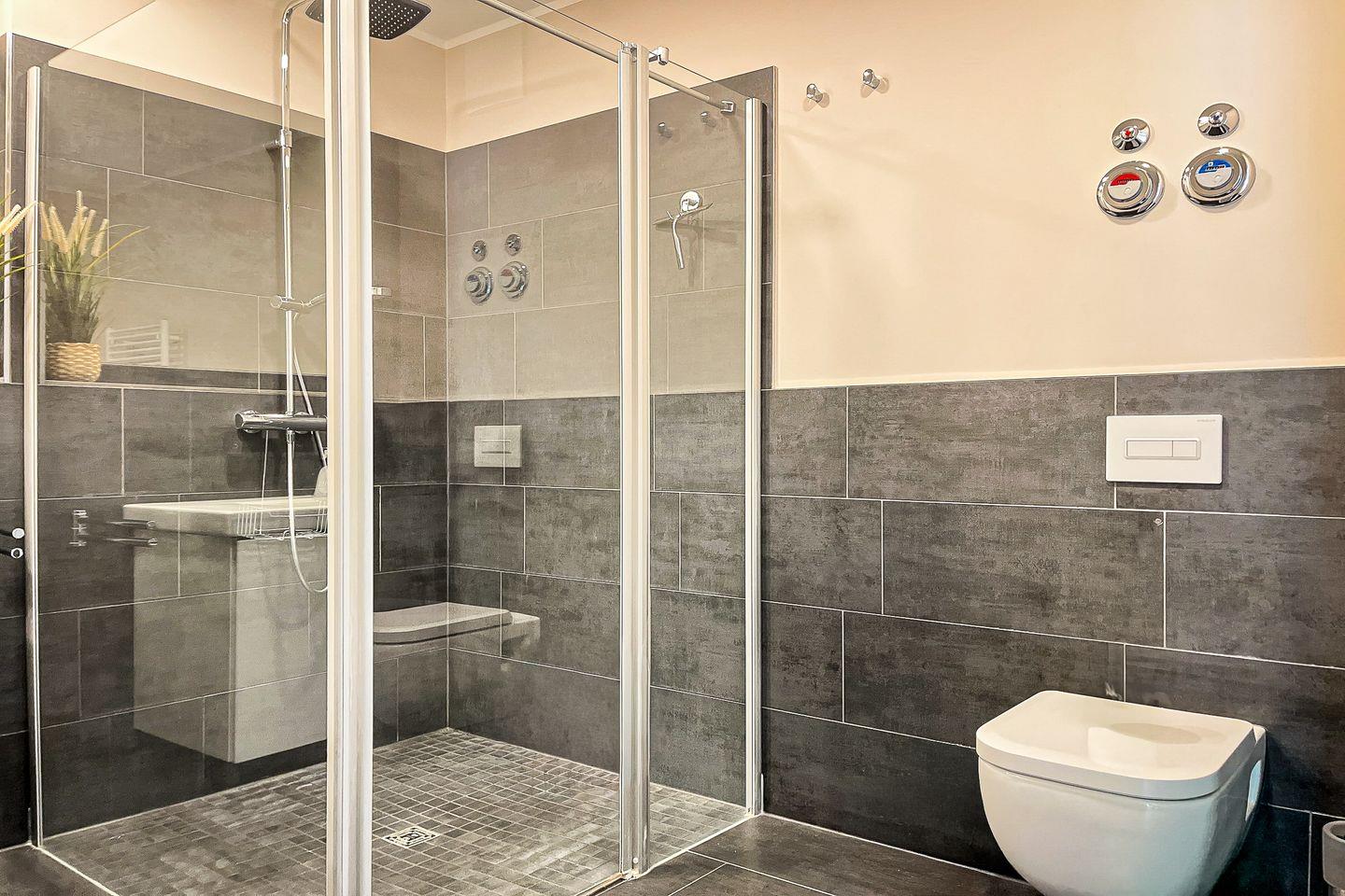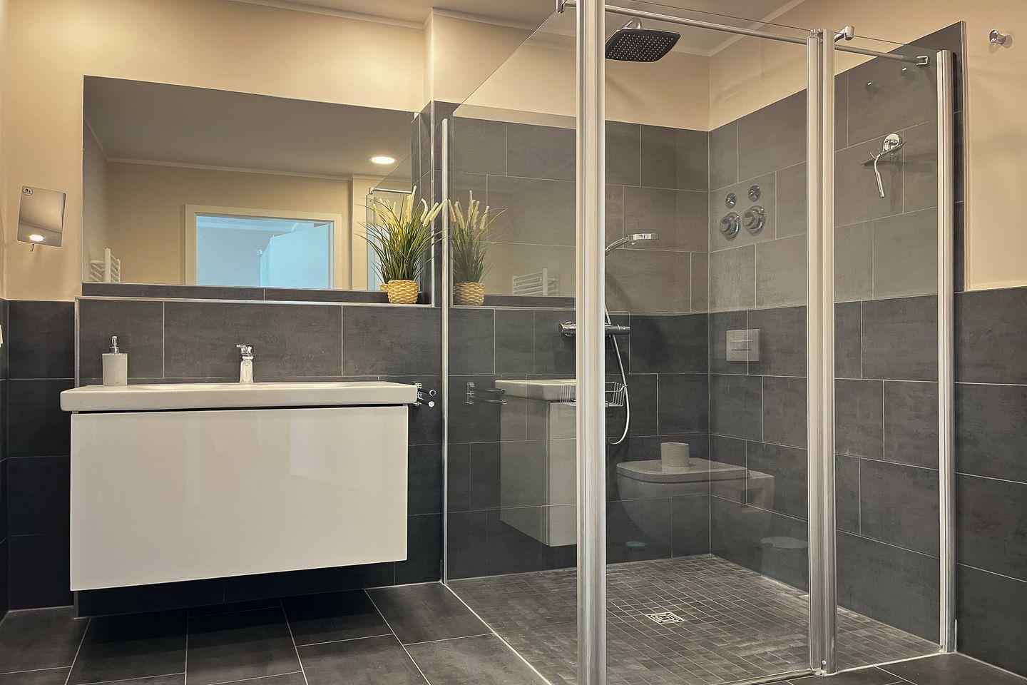 Das modern gestaltete Badezimmer bietet eine bodengleiche Dusche, ein WC, ein Waschbecken, einen Kosmetikspiegel sowie einen Haartrockner – ideal für einen erfrischenden Start in den Tag.
