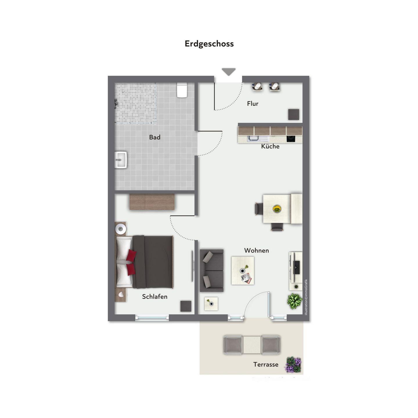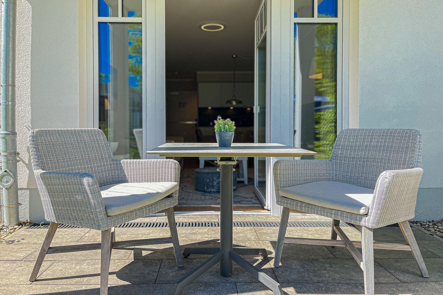 Ein Highlight ist die Terrasse mit Gartenmöbeln – ein idealer Ort für ein Frühstück an der frischen Luft oder erholsame Stunden im Freien.