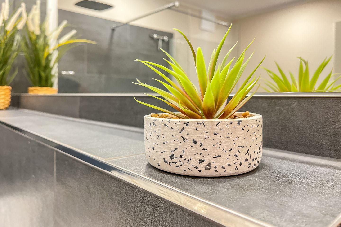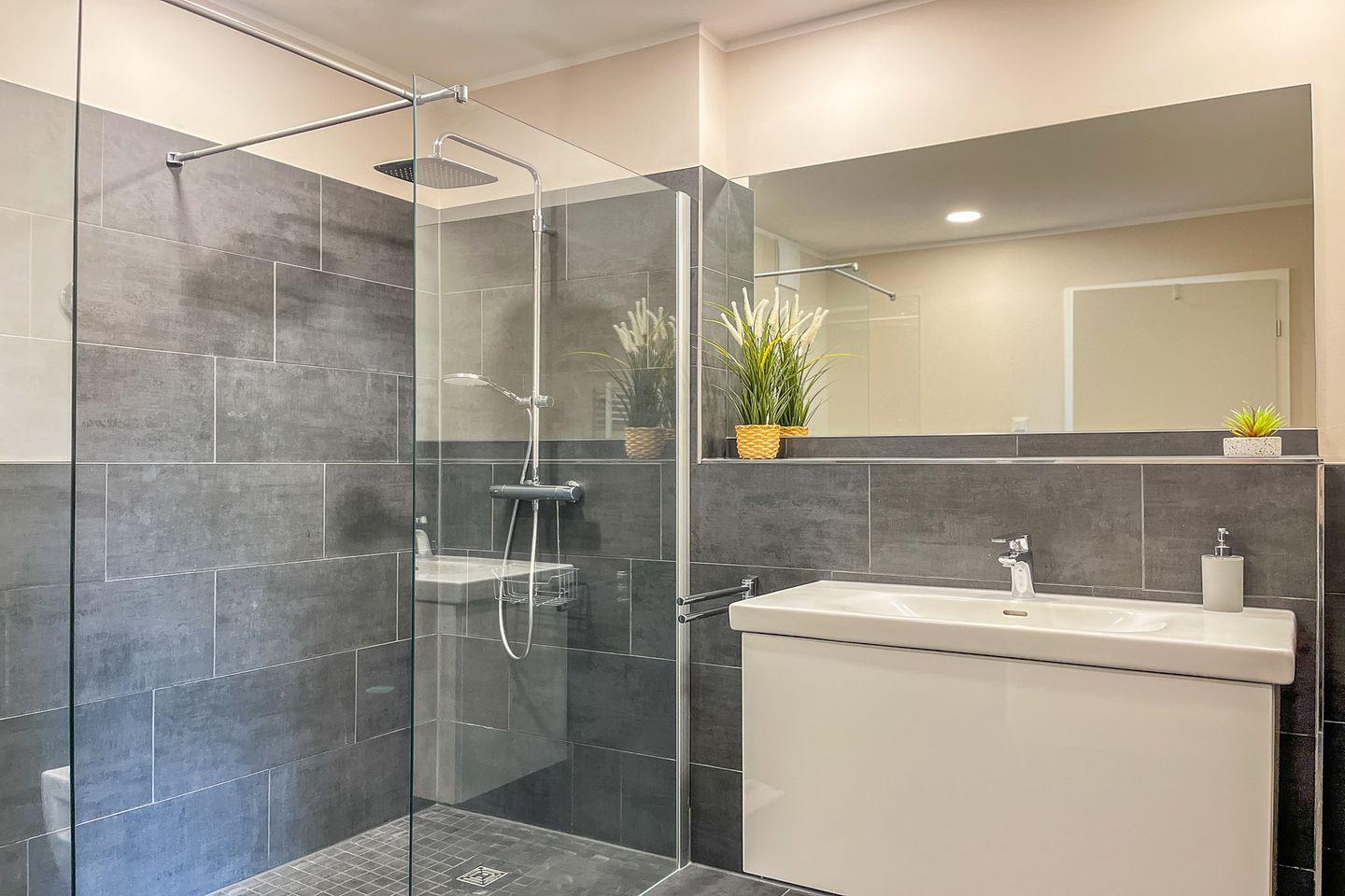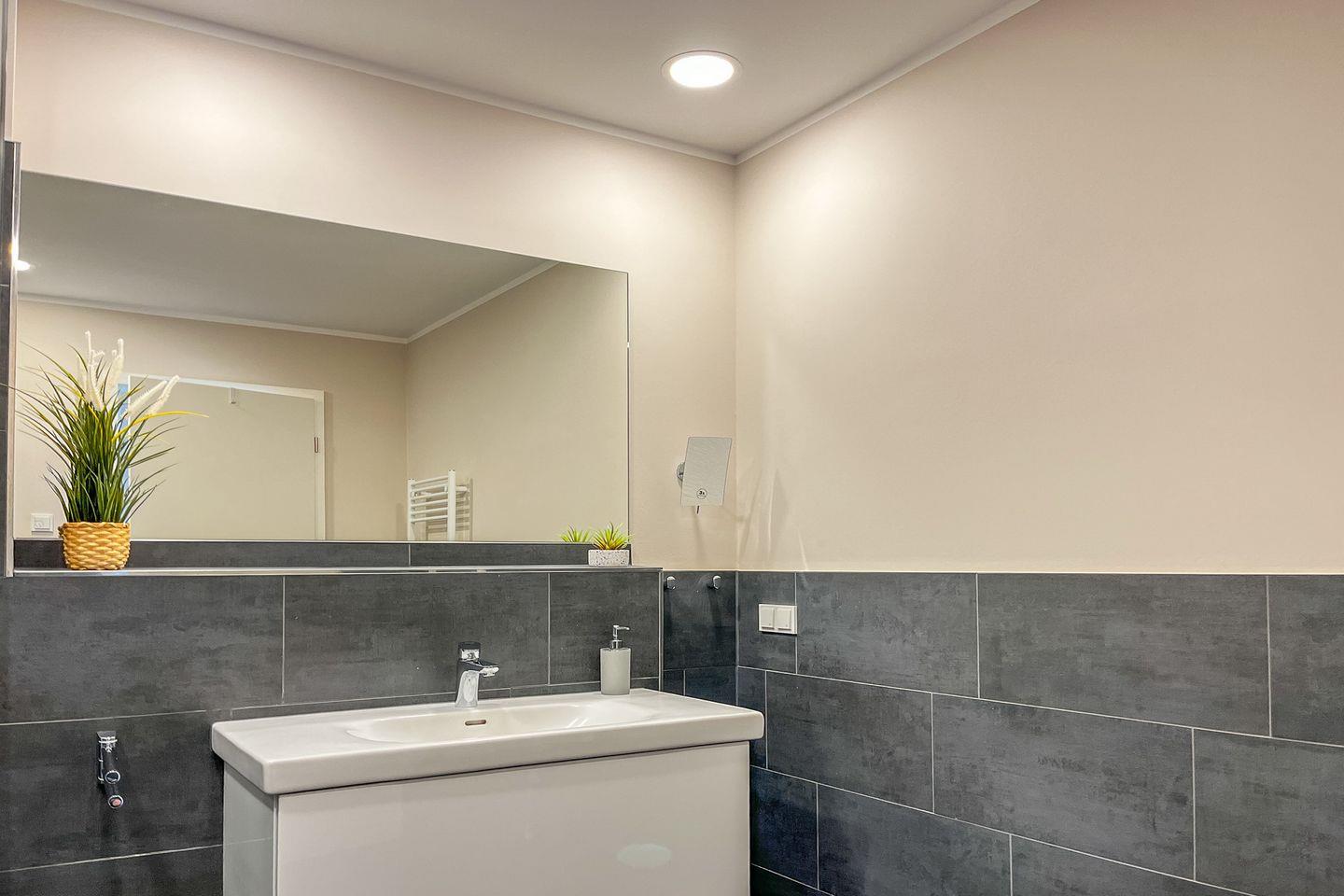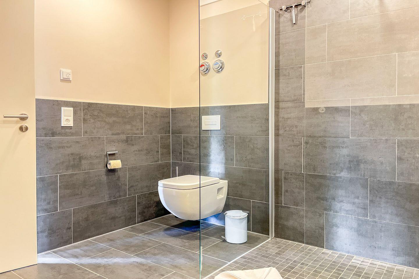 Das moderne Badezimmer präsentiert sich hell, großzügig und funktional. Es verfügt über eine bodengleiche Dusche, WC, Waschbecken, Kosmetikspiegel sowie einen Haartrockner und bietet damit angenehmen Komfort für den täglichen Start in den Urlaubstag.