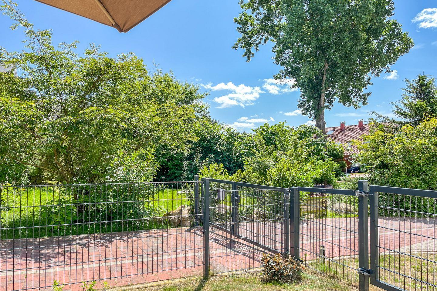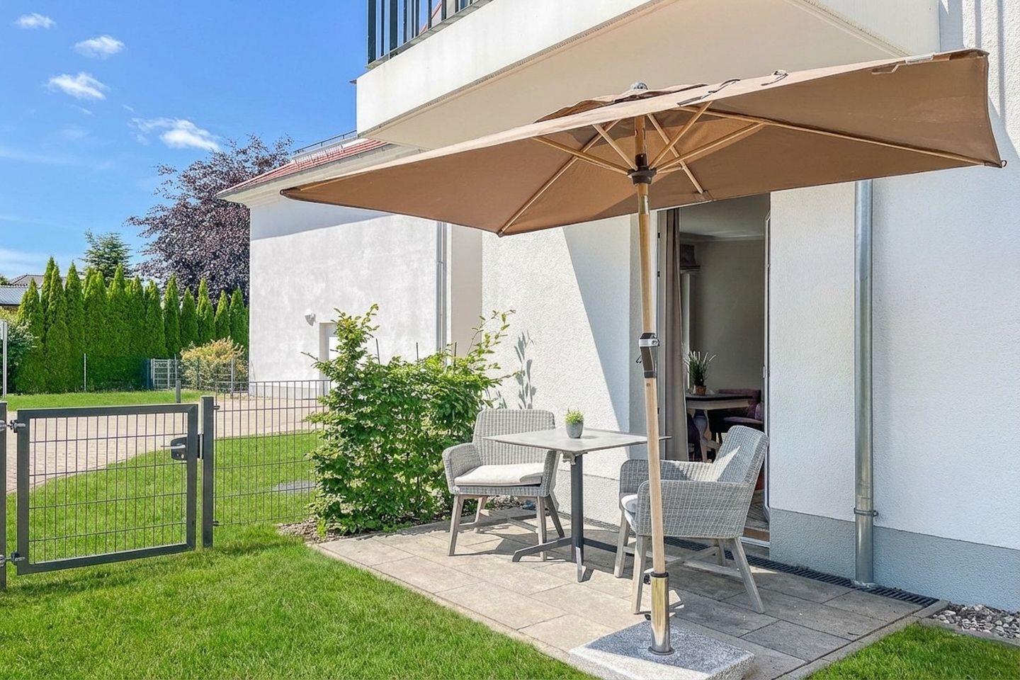 Ein echtes Highlight ist die möblierte Terrasse: Hier genießt Du die frische Ostseeluft, sonnige Nachmittagsstunden und eine angenehm ruhige Atmosphäre. Dank der geschützten Lage eignet sich dieser Bereich ideal zum Lesen, Entspannen oder für gemütliche Mahlzeiten im Freien. Ein kleine stimmungsvoller Blick in Richtung Ostsee verleiht der Terrasse zusätzlich maritimen Charme.