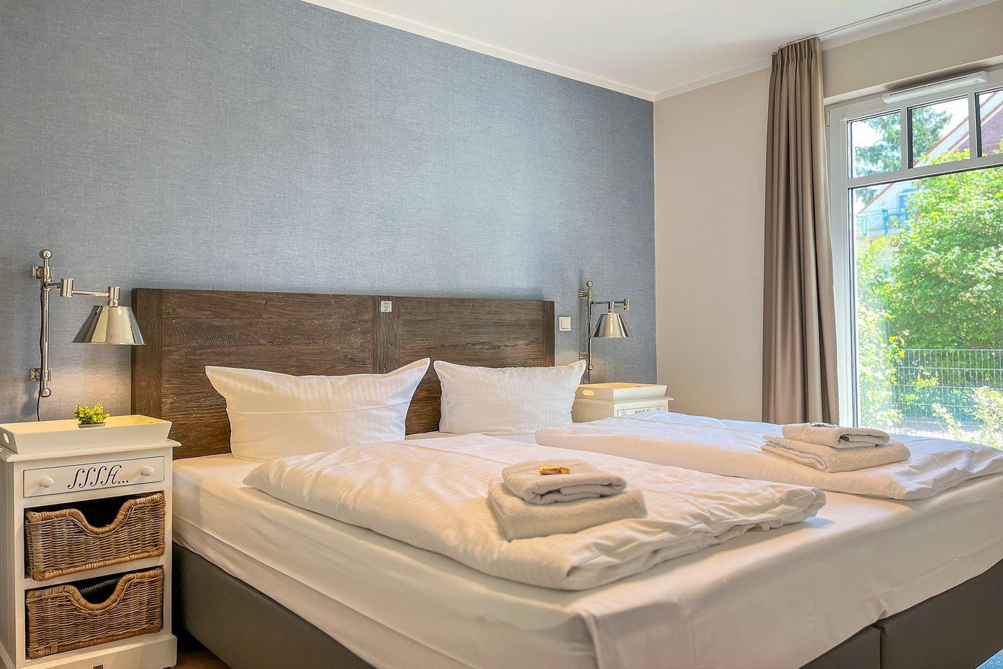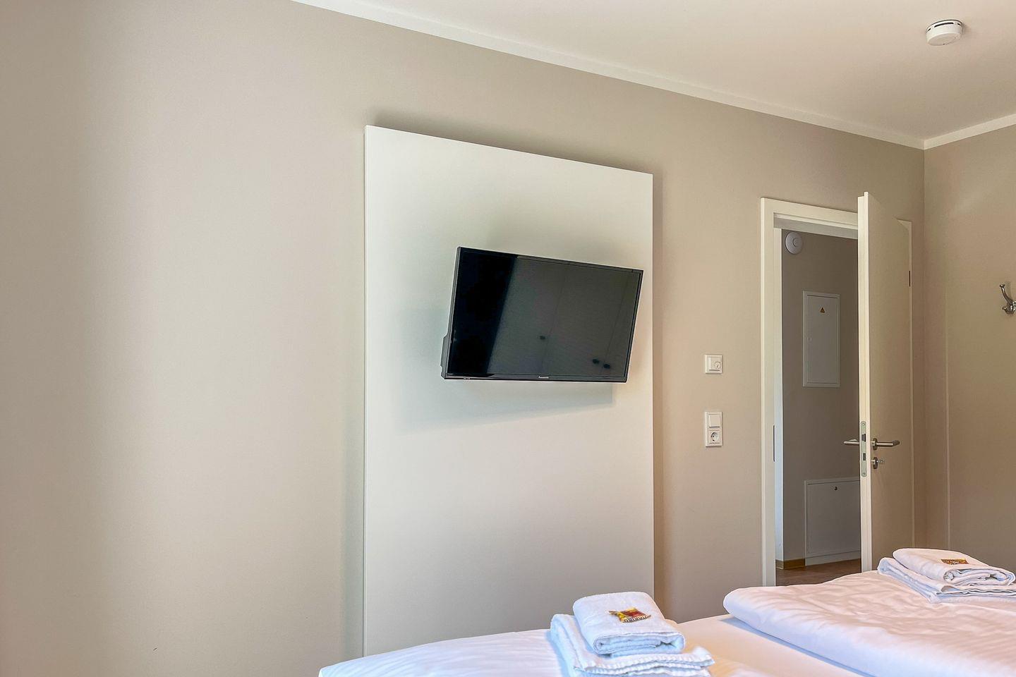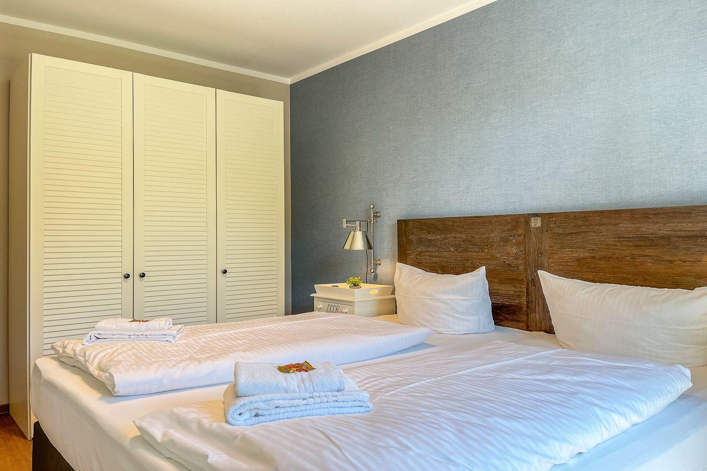 Im separaten Schlafzimmer erwartet Dich ein komfortables Doppelbett (2x 90x200 cm) das erholsame Nächte verspricht. Ein weiterer Smart-TV rundet den Raum ab und ermöglicht entspannte Stunden vor dem Einschlafen.