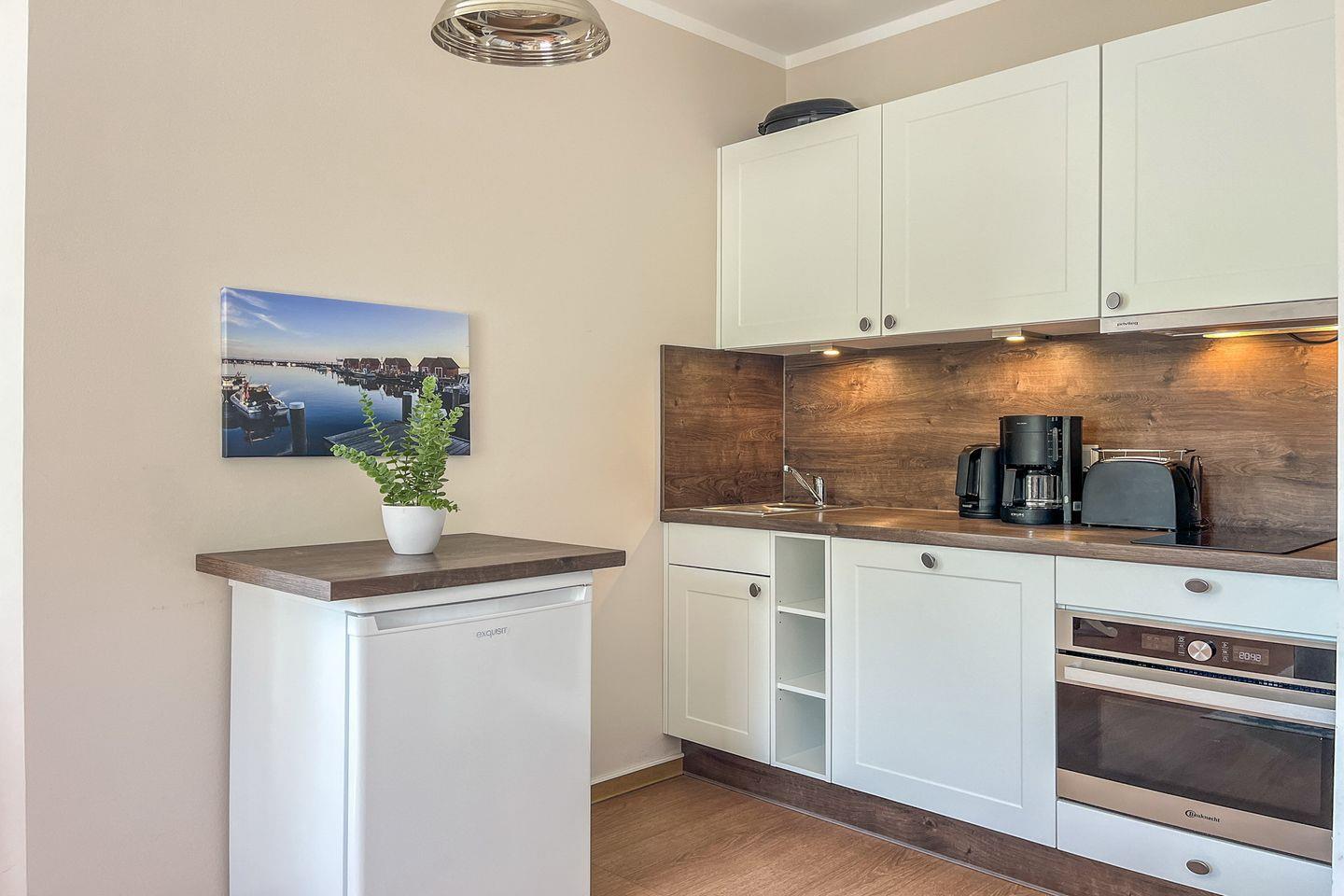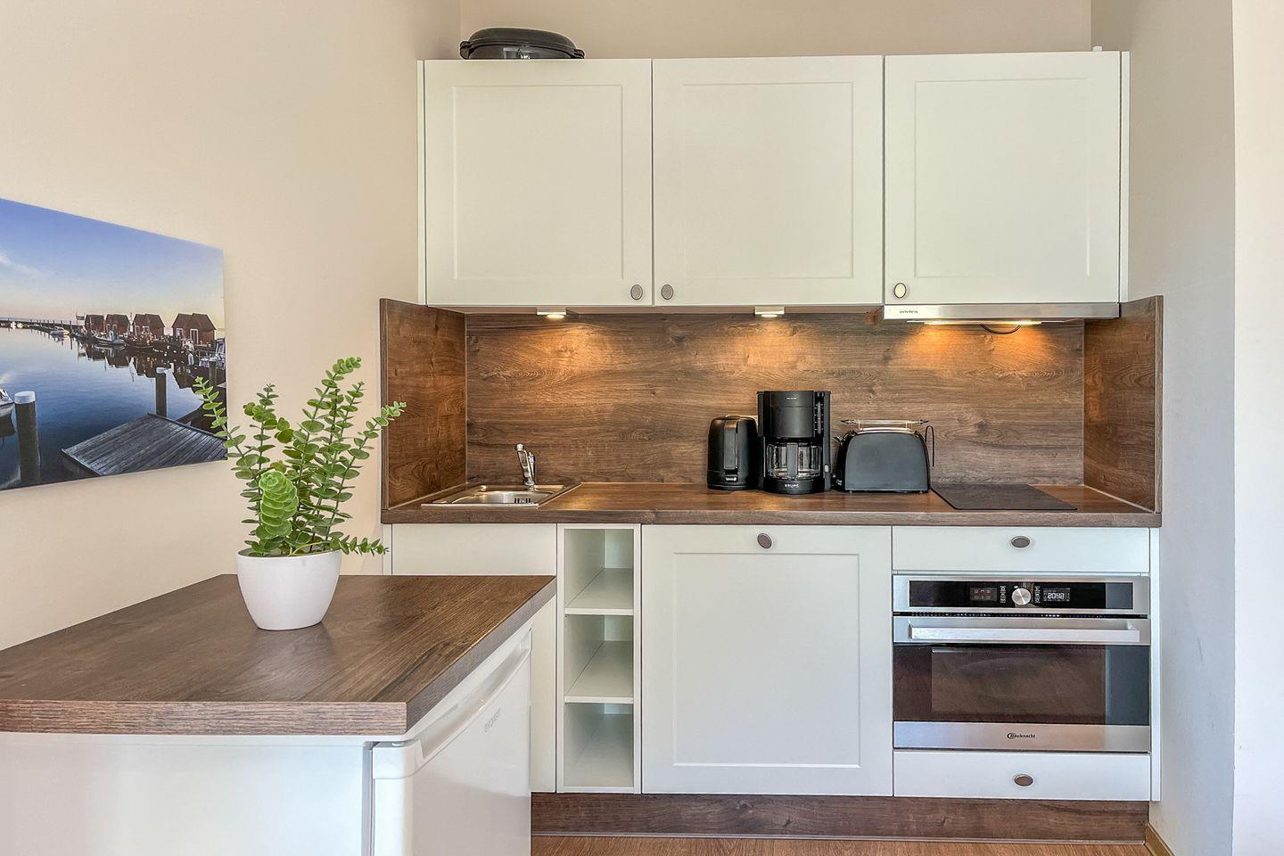 Die moderne Küchenzeile ist vollständig eingerichtet und lässt keine Wünsche offen: Cerankochfeld, Backofen, Spülmaschine, Kaffeemaschine, Wasserkocher, Toaster sowie alle wichtigen Küchenutensilien und Geschirr sind vorhanden.