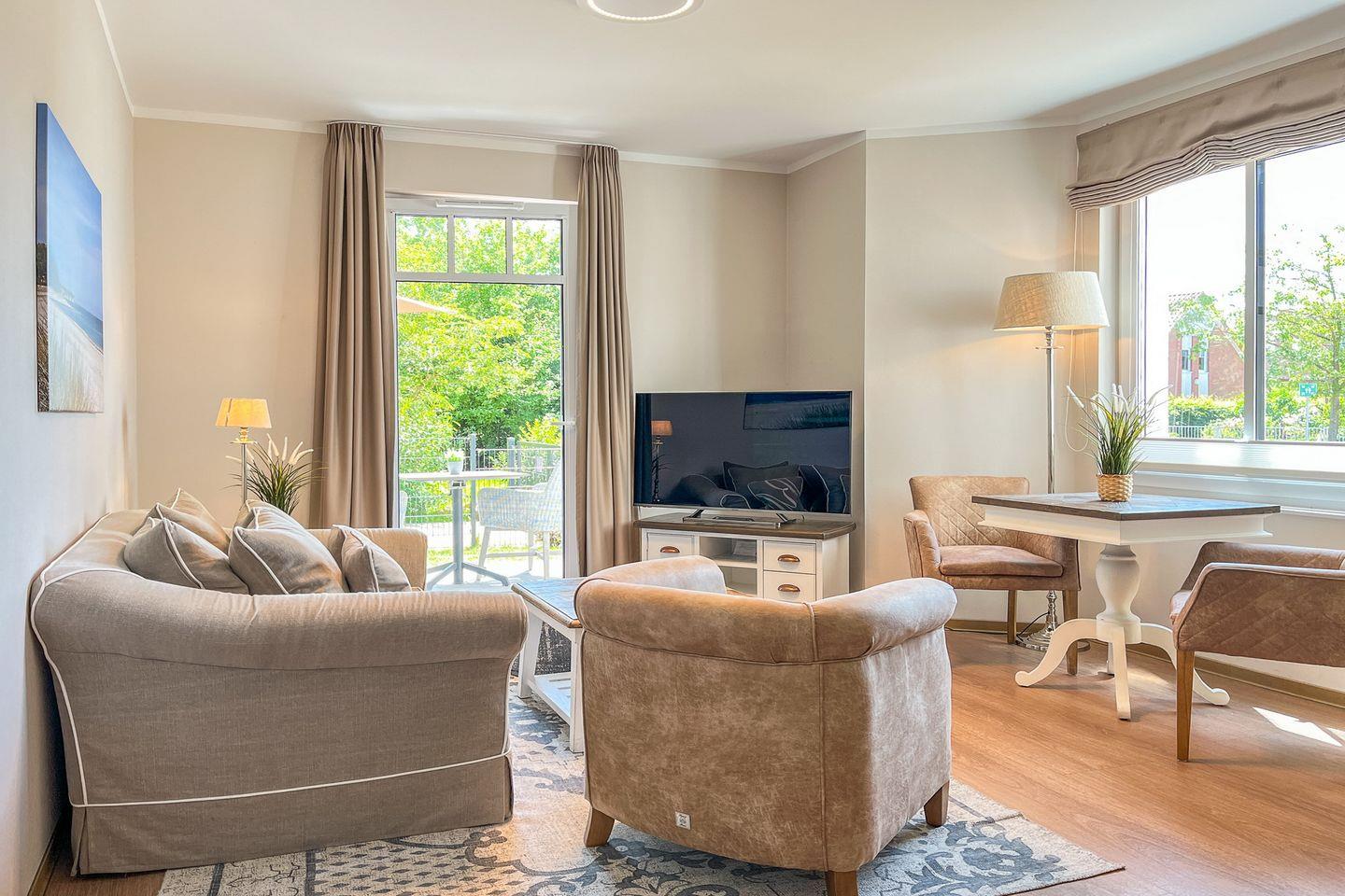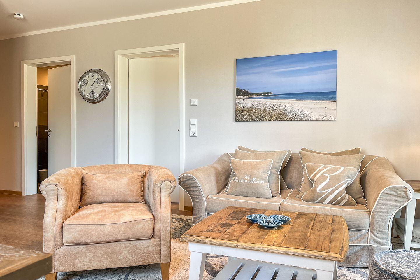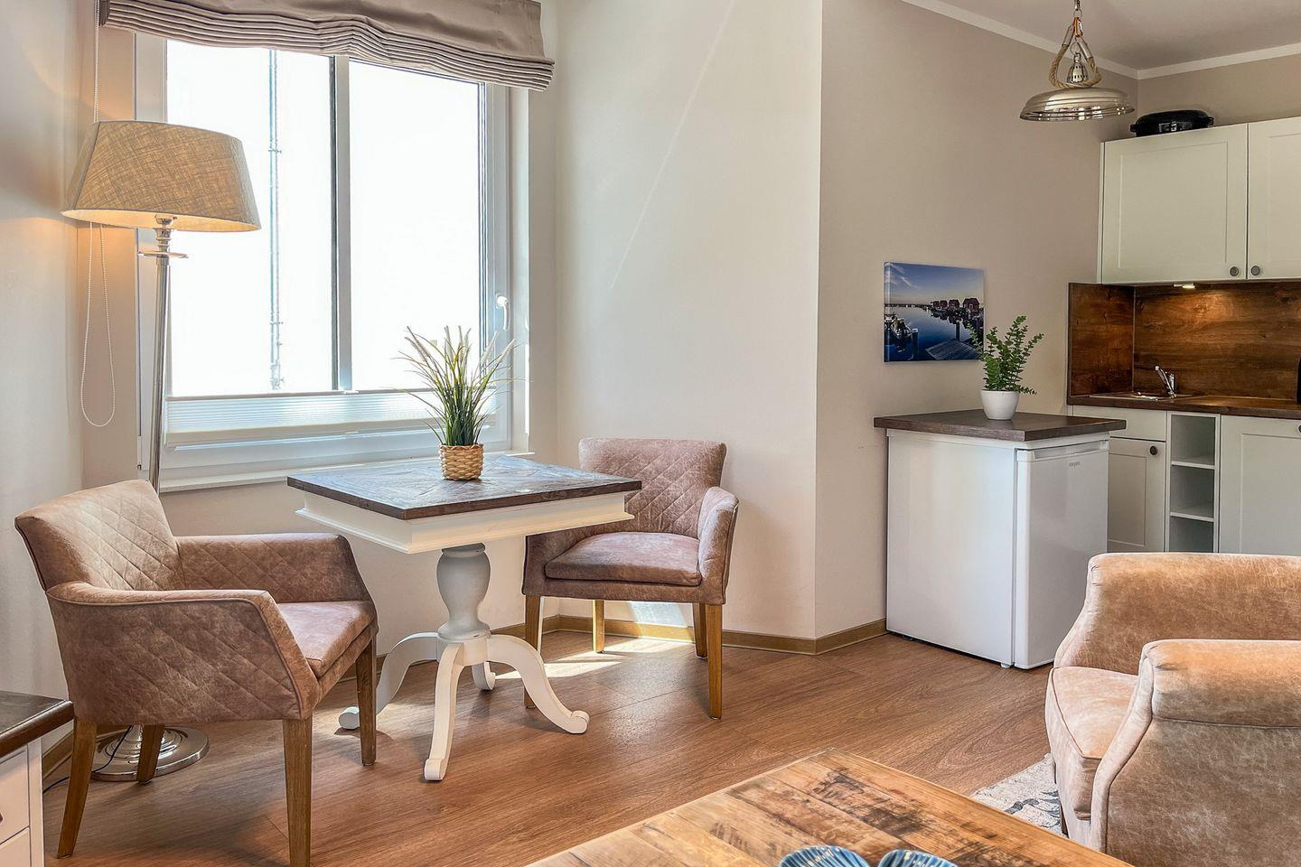 Der offene Wohnbereich lädt mit einem gemütlichen Sofa zum Entspannen ein - perfekt für ruhige Abende nach einem Strandspaziergang. Ein Smart-TV sorgt für Unterhaltung, während der Essplatz am Fenster Raum für gemeinsame Mahlzeiten oder den ersten Kaffee am Morgen bietet und sich fließend in den Wohnraum einfügt.