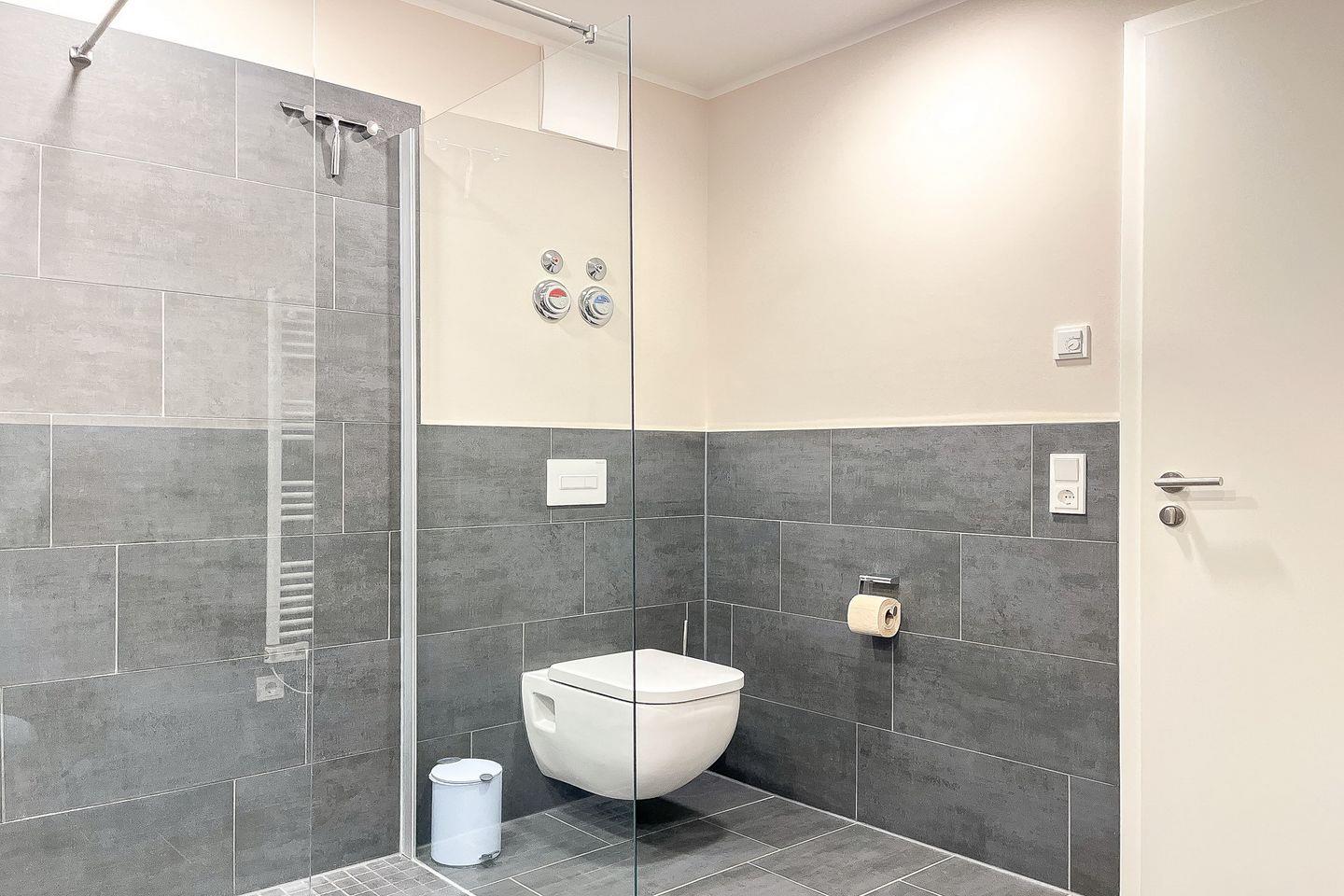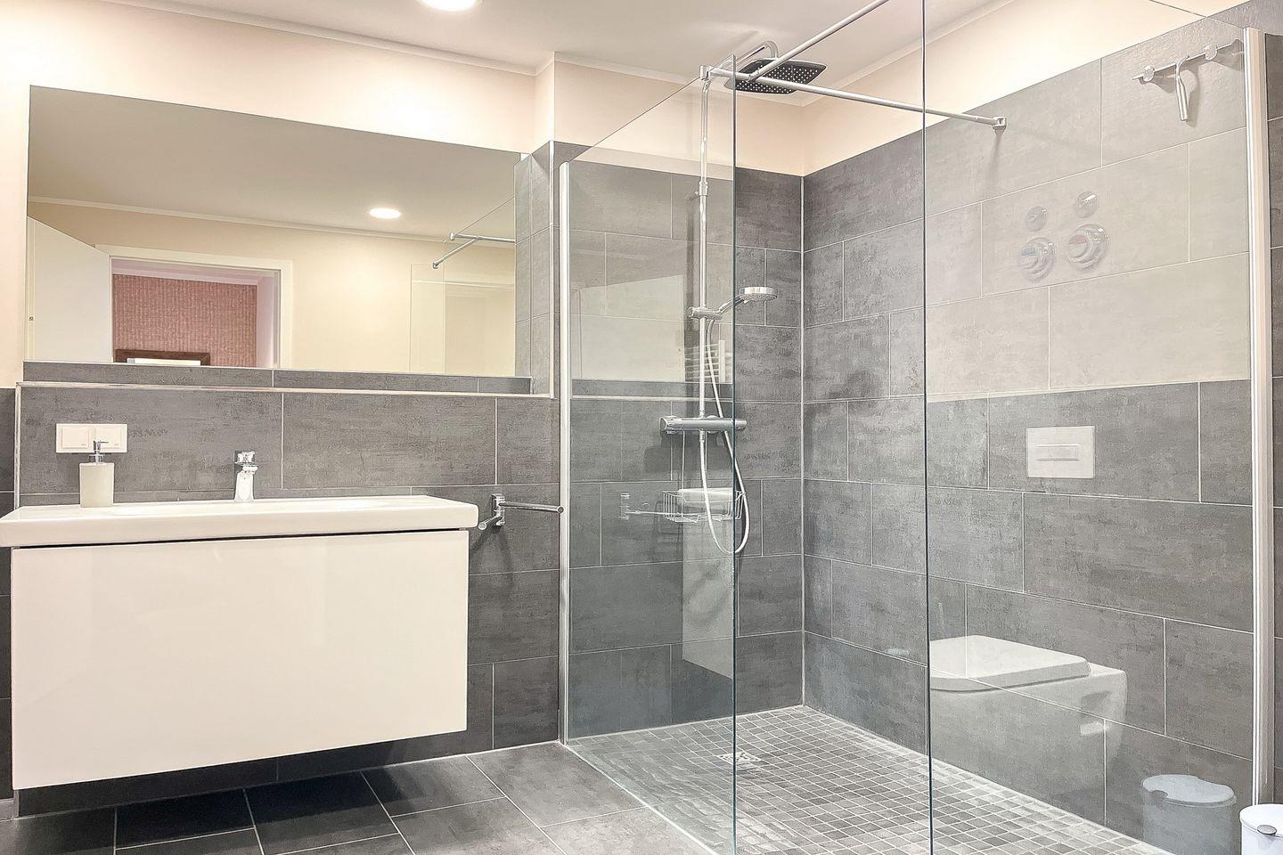 Das Badezimmer ist mit bodengleicher Dusche, WC, Waschbecken, Kosmetikspiegel und Haartrockner komfortabel ausgestattet.