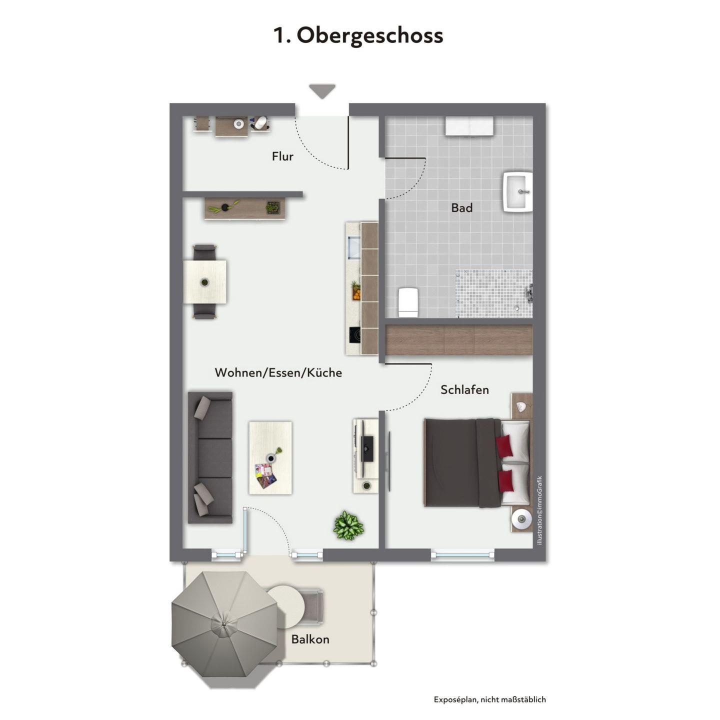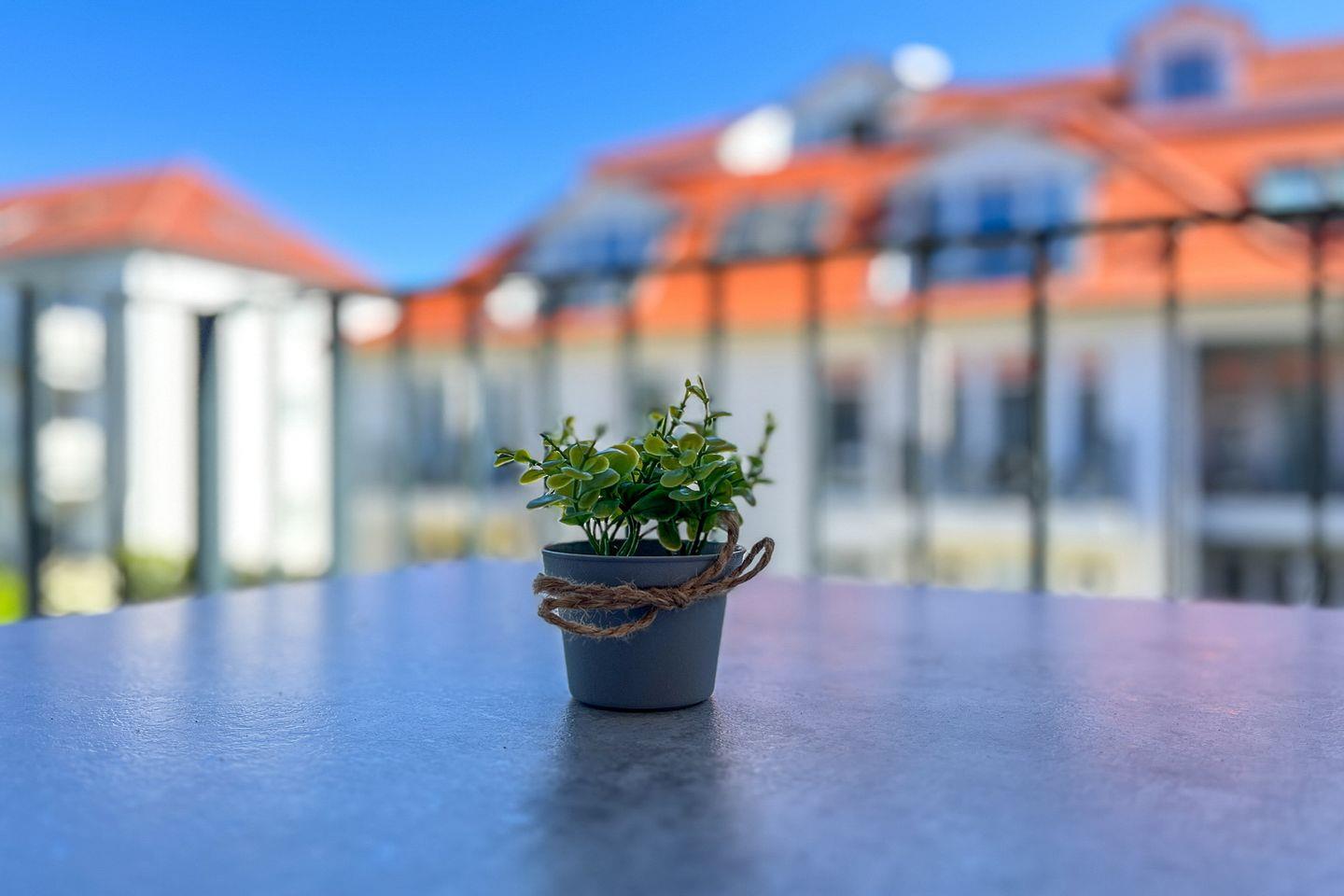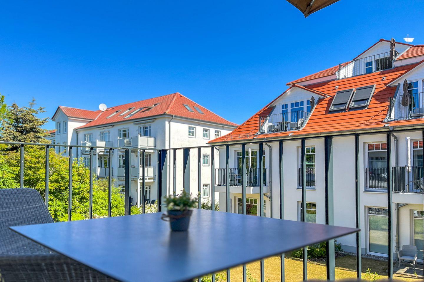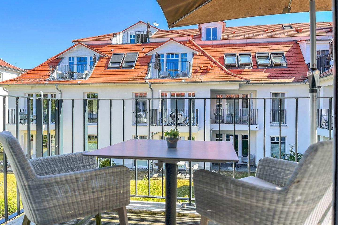 Zum Verweilen lädt der Balkon mit Gartenmöbeln und Blick ins Grüne ein – ideal für einen ruhigen Start in den Tag oder ein Abendessen im Freien.