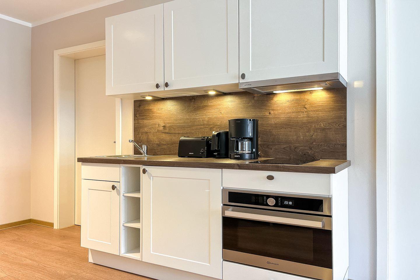 Die Küche ist offen in den Wohnraum integriert und gut ausgestattet: Cerankochfeld, Backofen, Kühlschrank mit Gefrierfach, Spülmaschine, Kaffeemaschine, Wasserkocher, Toaster sowie Geschirr und Kochutensilien sind vorhanden.
