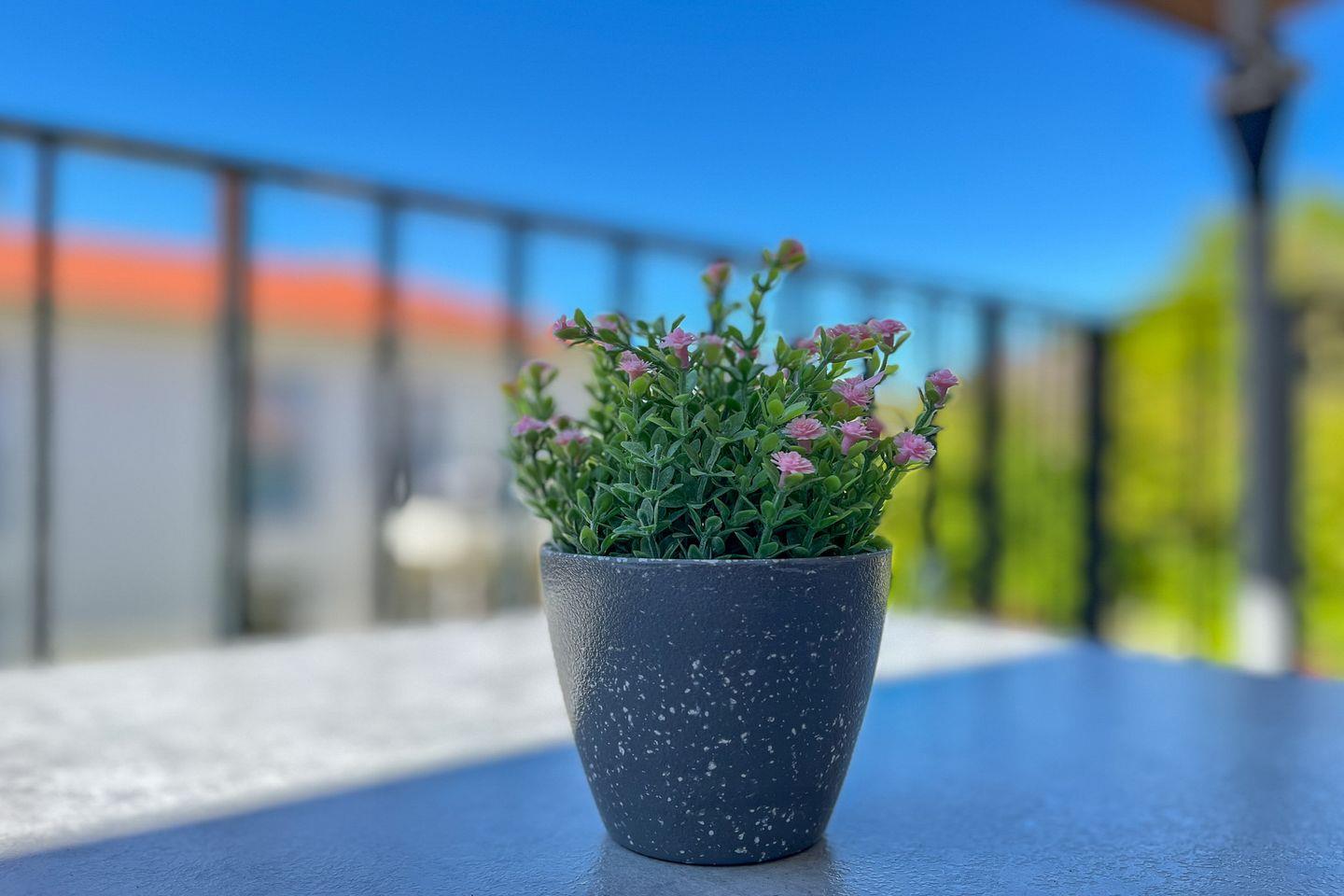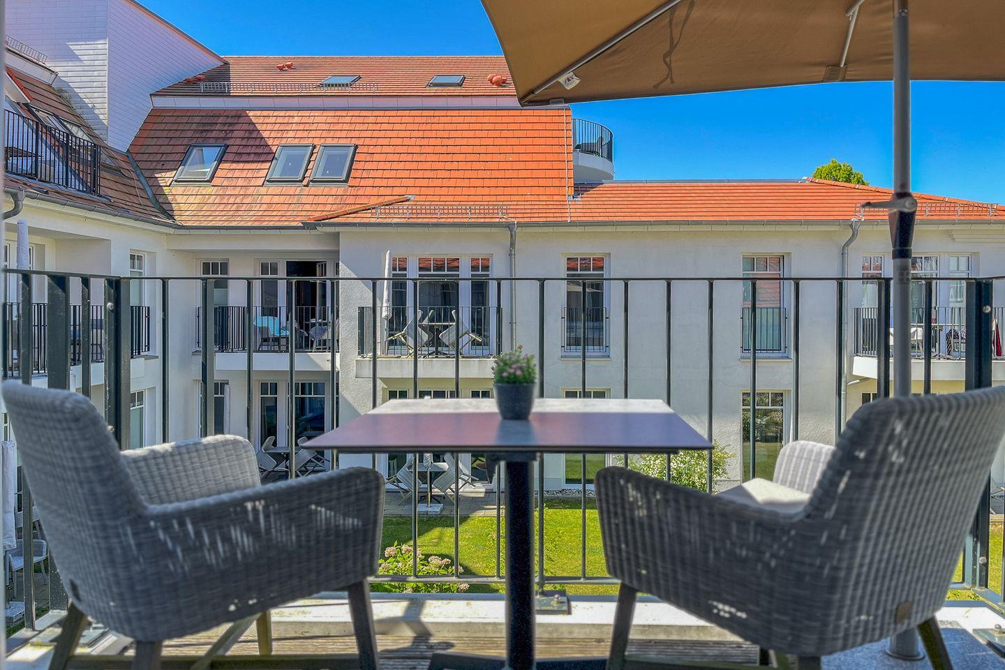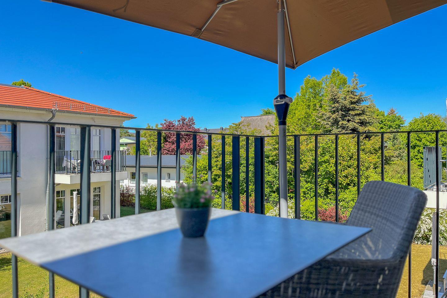 Besonderes Highlight der Wohnung ist der Balkon mit Gartenmöbeln und Sonnenschirm – ein wunderbarer Ort für ein Frühstück an der frischen Luft oder entspannte Stunden am Nachmittag.