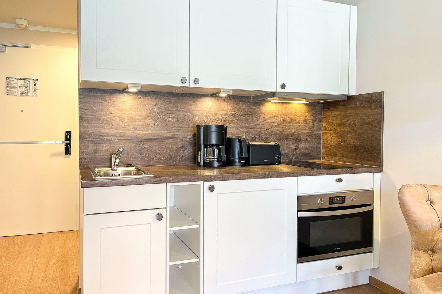Die Küche ist offen zum Wohnbereich gestaltet und verfügt über Ceranfeld, Backofen, Kühlschrank mit Gefrierfach, Kaffeemaschine, Wasserkocher, Toaster sowie alle nötigen Küchenutensilien für eine entspannte Selbstverpflegung.