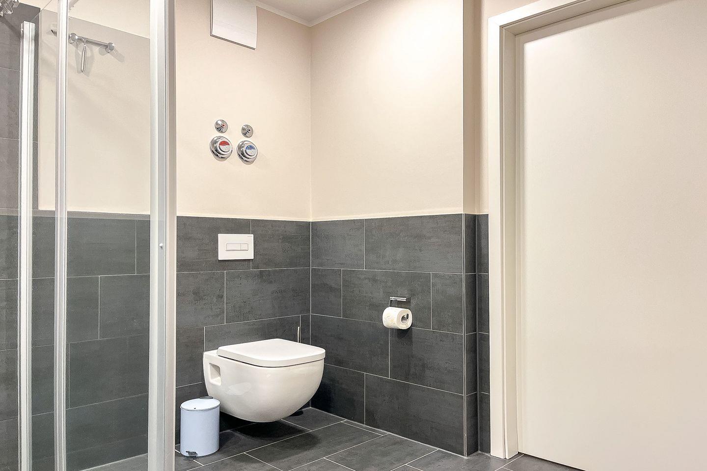 Das Badezimmer ist hochwertig mit einer bodengleichen Dusche, WC, Waschbecken, Kosmetikspiegel und Haartrockner ausgestattet und bietet angenehmen Komfort.
