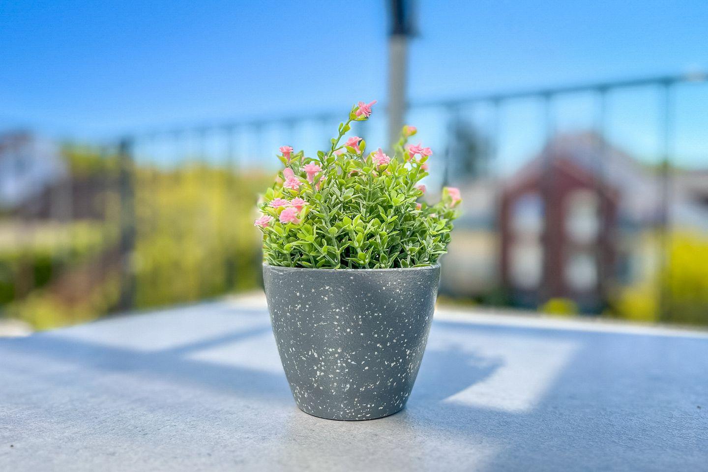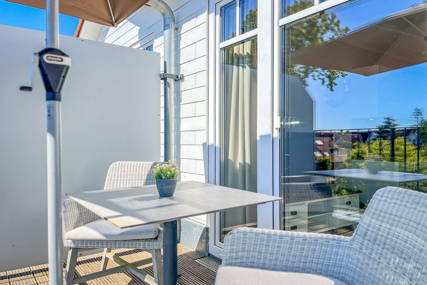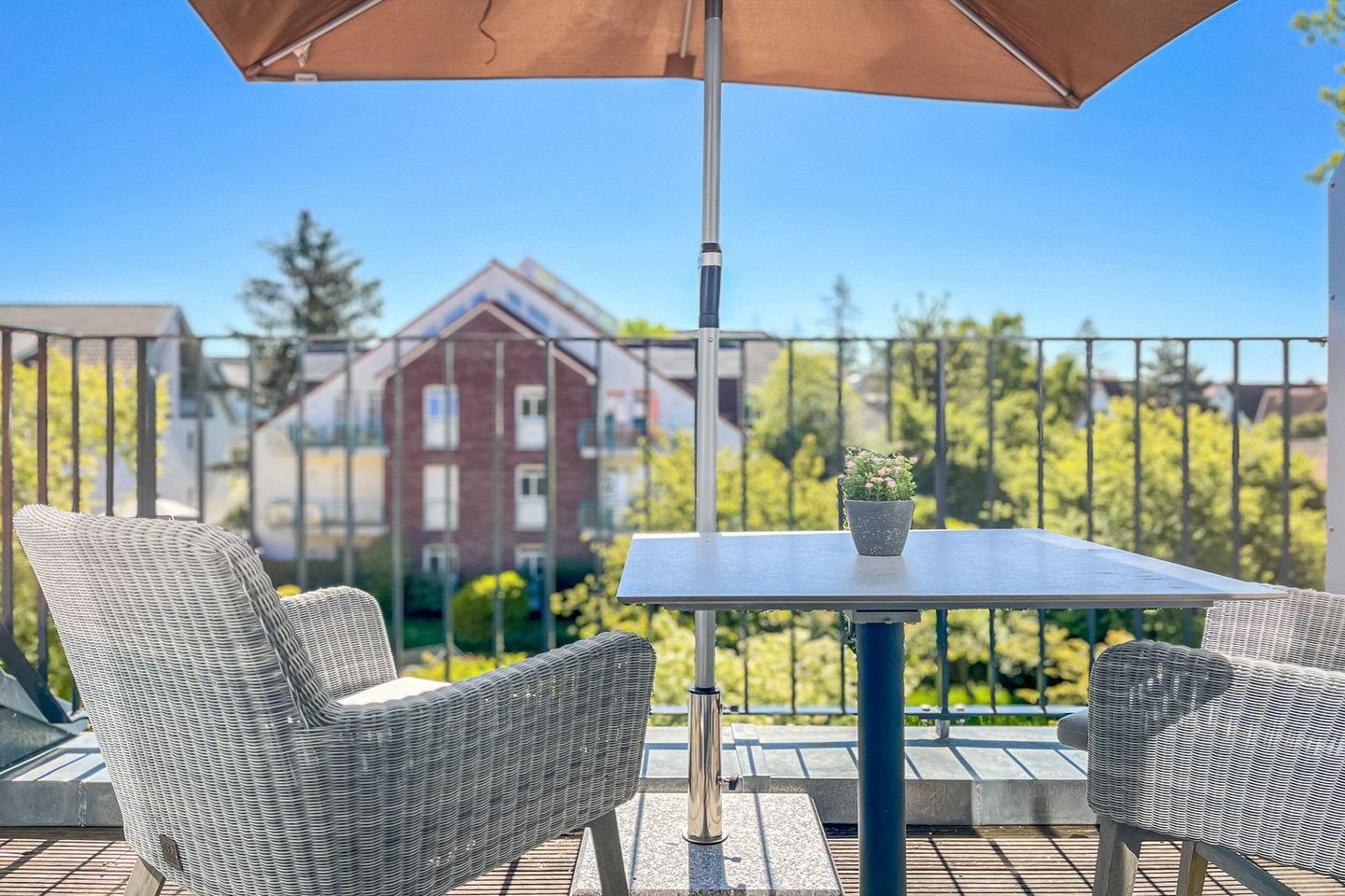 Ein Balkon mit Gartenmöbeln und Sonnenschirm lädt zum Verweilen im Freien ein – ob bei einem Frühstück oder einem Glas Wein am Abend.