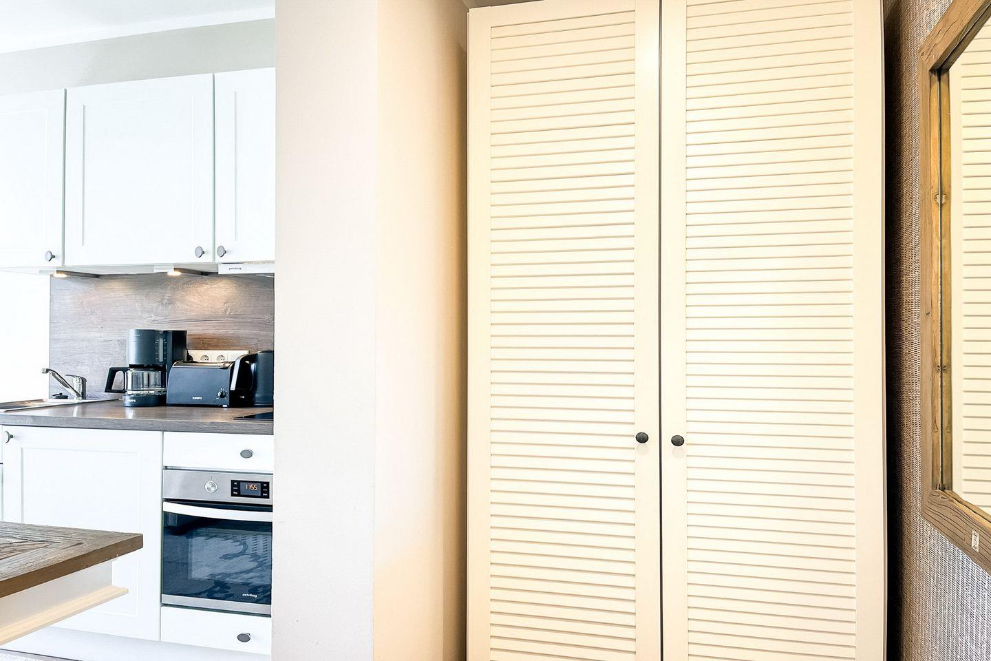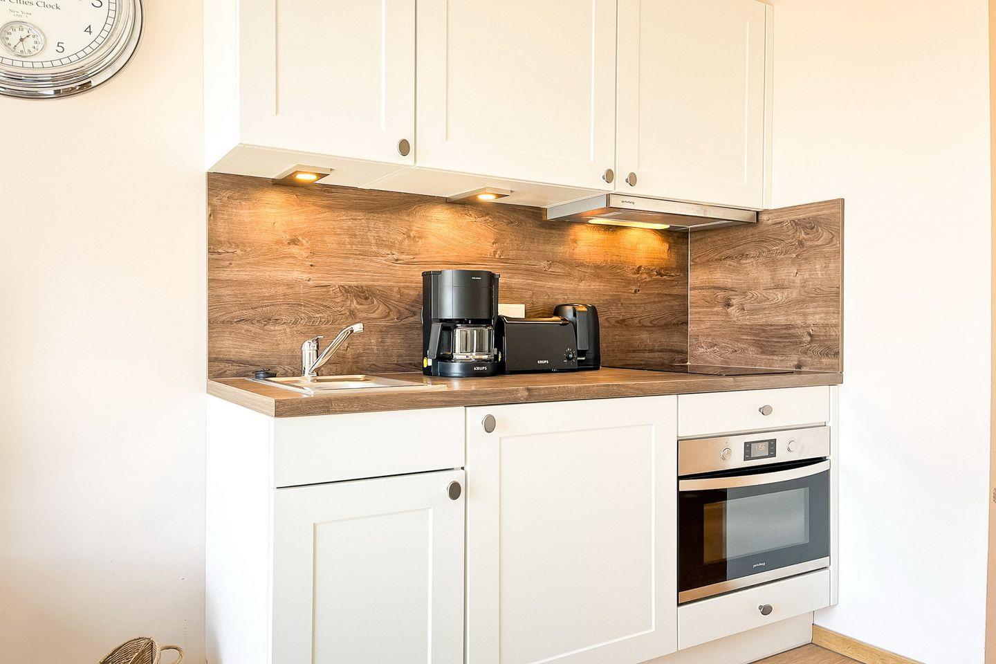 Die angrenzende Küchenzeile verfügt über Ceranfeld, Backofen, Kühlschrank mit Gefrierfach, Kaffeemaschine, Wasserkocher, Toaster sowie Kochutensilien und Geschirr – ideal für die Selbstverpflegung.