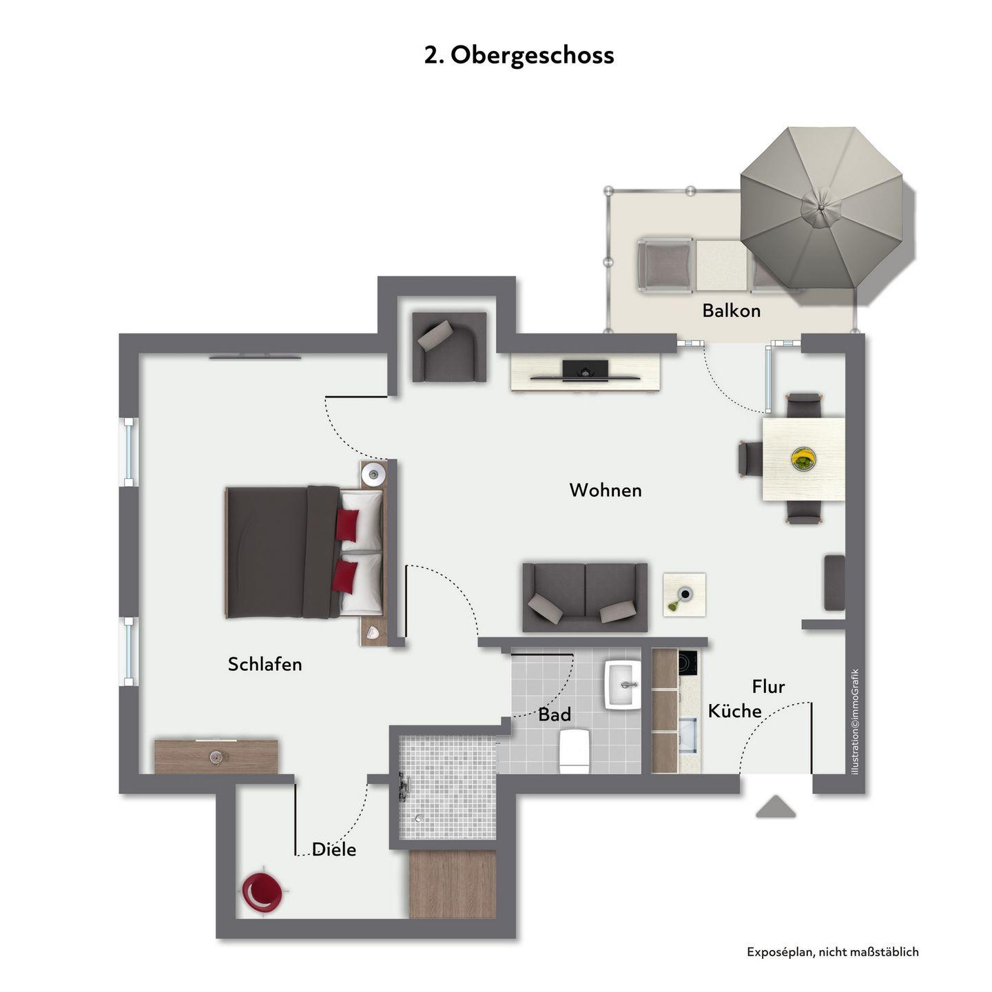 Die Ferienwohnung Nr. 59 in der strandnahen Anlage Baltischer Hof ist eine 2-Zimmer-Wohnung für bis zu 3 Personen und liegt im 2. Obergeschoss. Sie verfügt über ein Wohnzimmer mit Schlafcouch und integrierter Küchenzeile, ein Bad mit Dusche, ein Schlafzimmer und einen Balkon mit Meerblick.