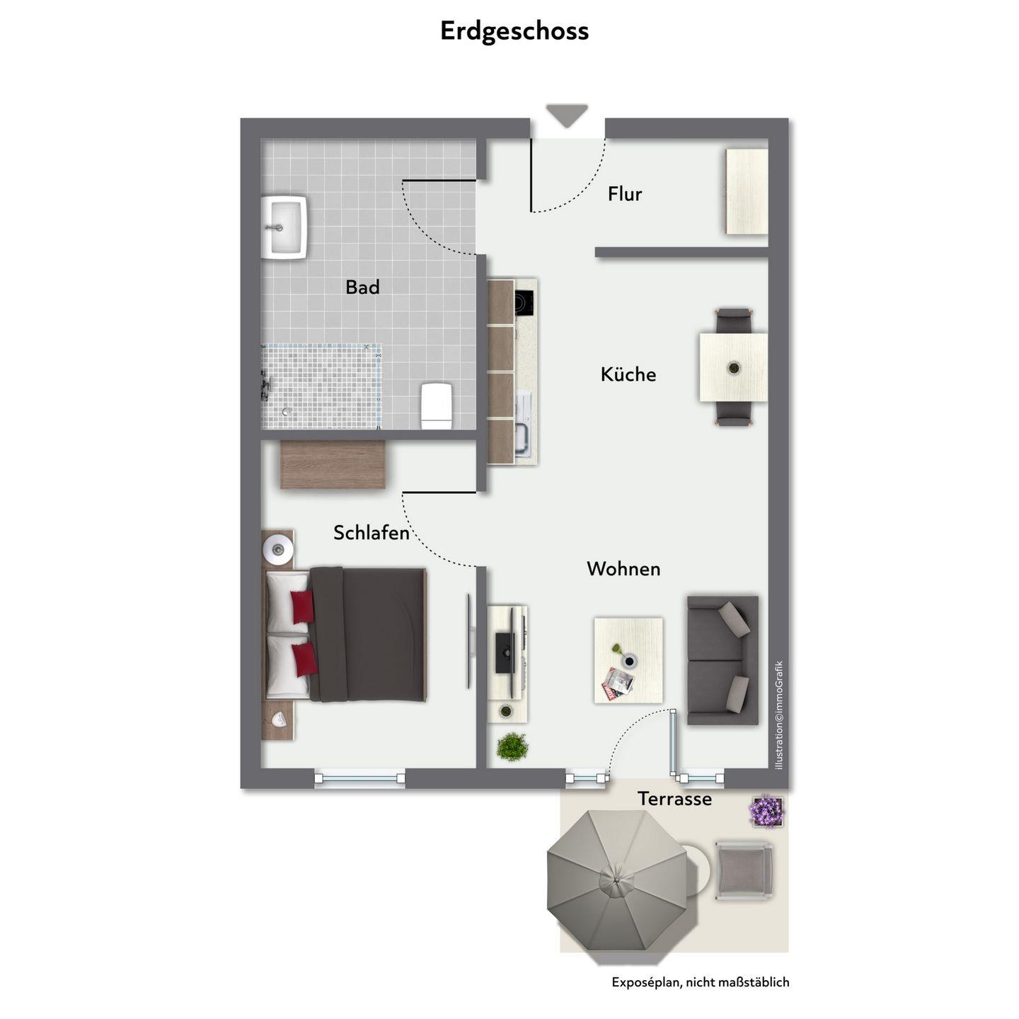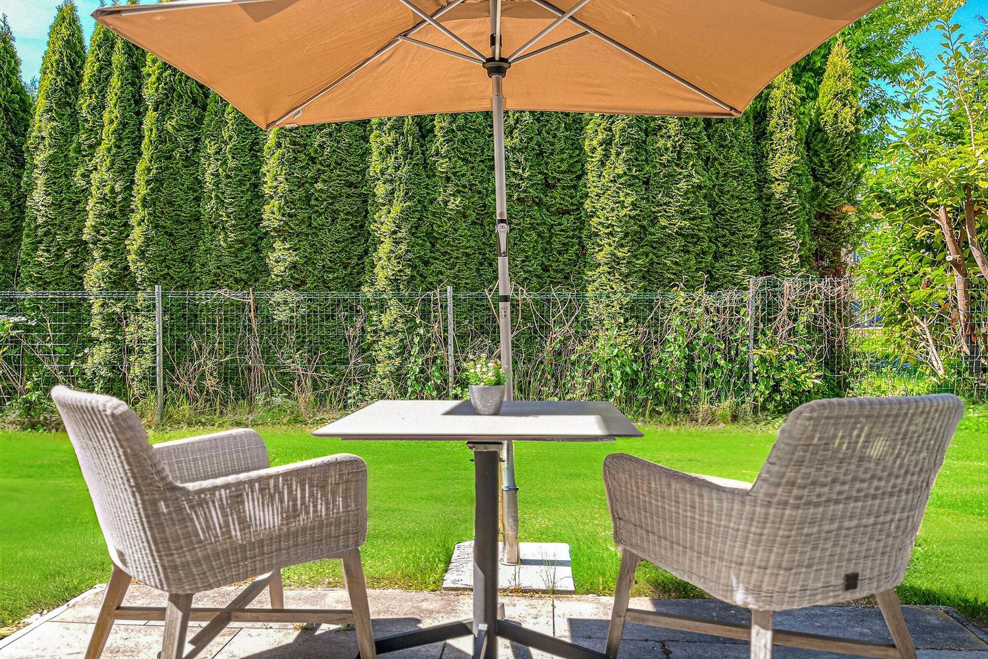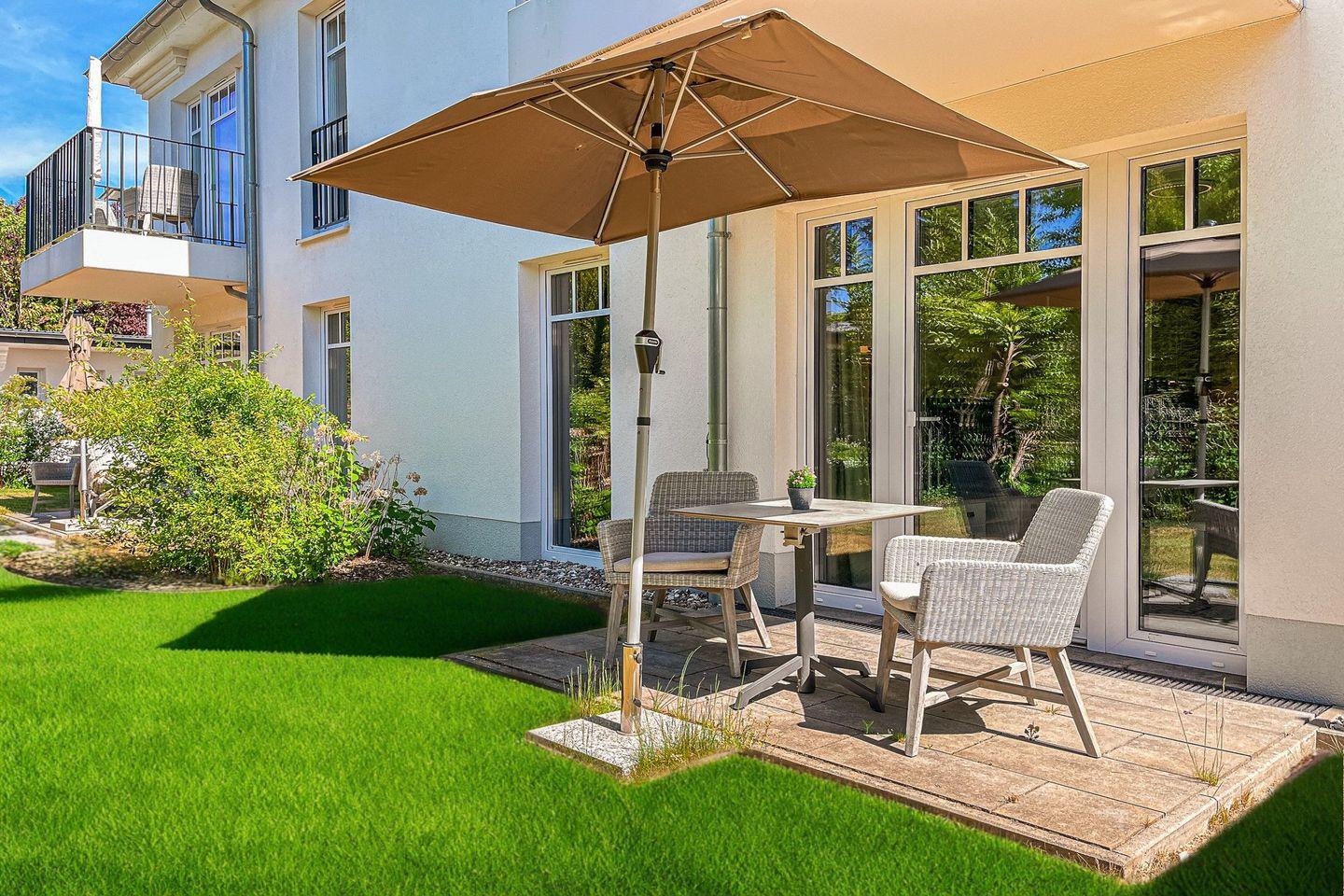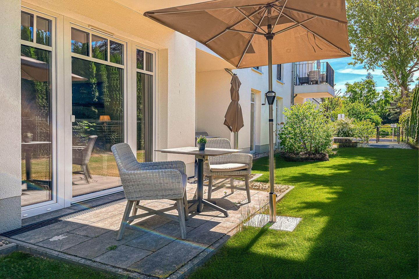 Ein besonderes Extra ist die möblierte Terrasse mit Gartenblick und Sonnenschirm – perfekt für einen ruhigen Start in den Tag oder entspannte Stunden im Freien.