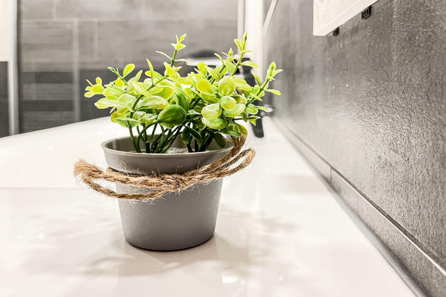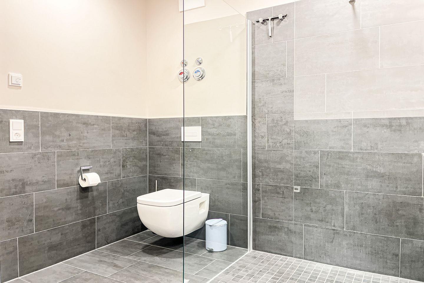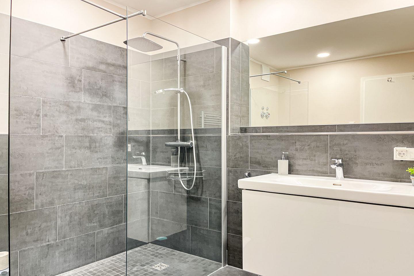 Das Badezimmer ist mit einer bodengleichen Dusche, WC, Waschbecken, Kosmetikspiegel und Haartrockner ausgestattet – praktisch und modern zugleich.