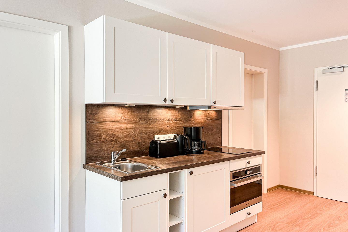 Die offen integrierte Küche ist vollständig eingerichtet: Cerankochfeld, Backofen, Kühlschrank mit Gefrierfach, Kaffeemaschine, Wasserkocher, Toaster und sämtliches Koch- und Essgeschirr stehen bereit – ideal für Selbstversorger.