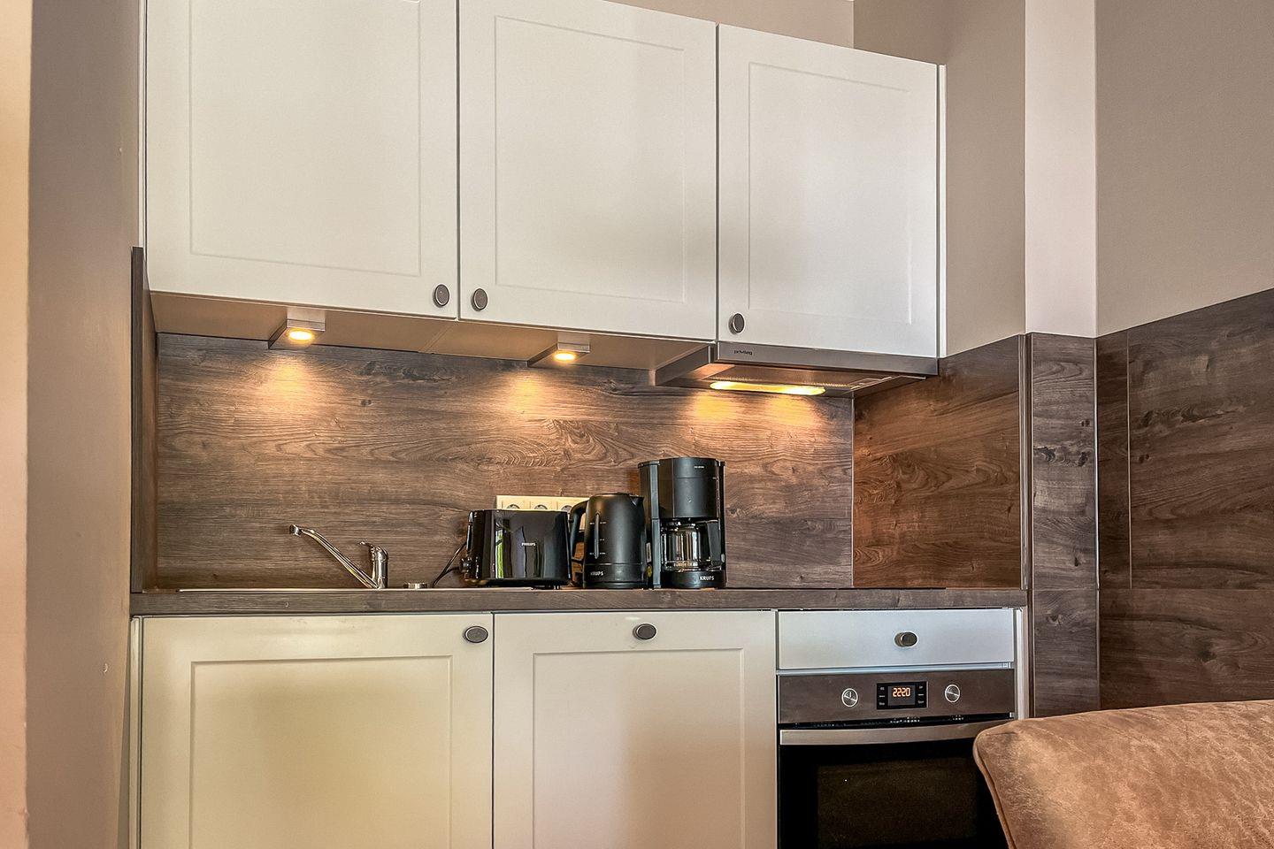Die offen gestaltete Küche ist hochwertig eingerichtet und bietet Dir alles für die Selbstverpflegung: Cerankochfeld, Backofen, Kühlschrank mit Gefrierfach, Spülmaschine, Kaffeemaschine, Wasserkocher, Toaster, Minibackofen sowie umfangreiches Koch- und Essgeschirr.