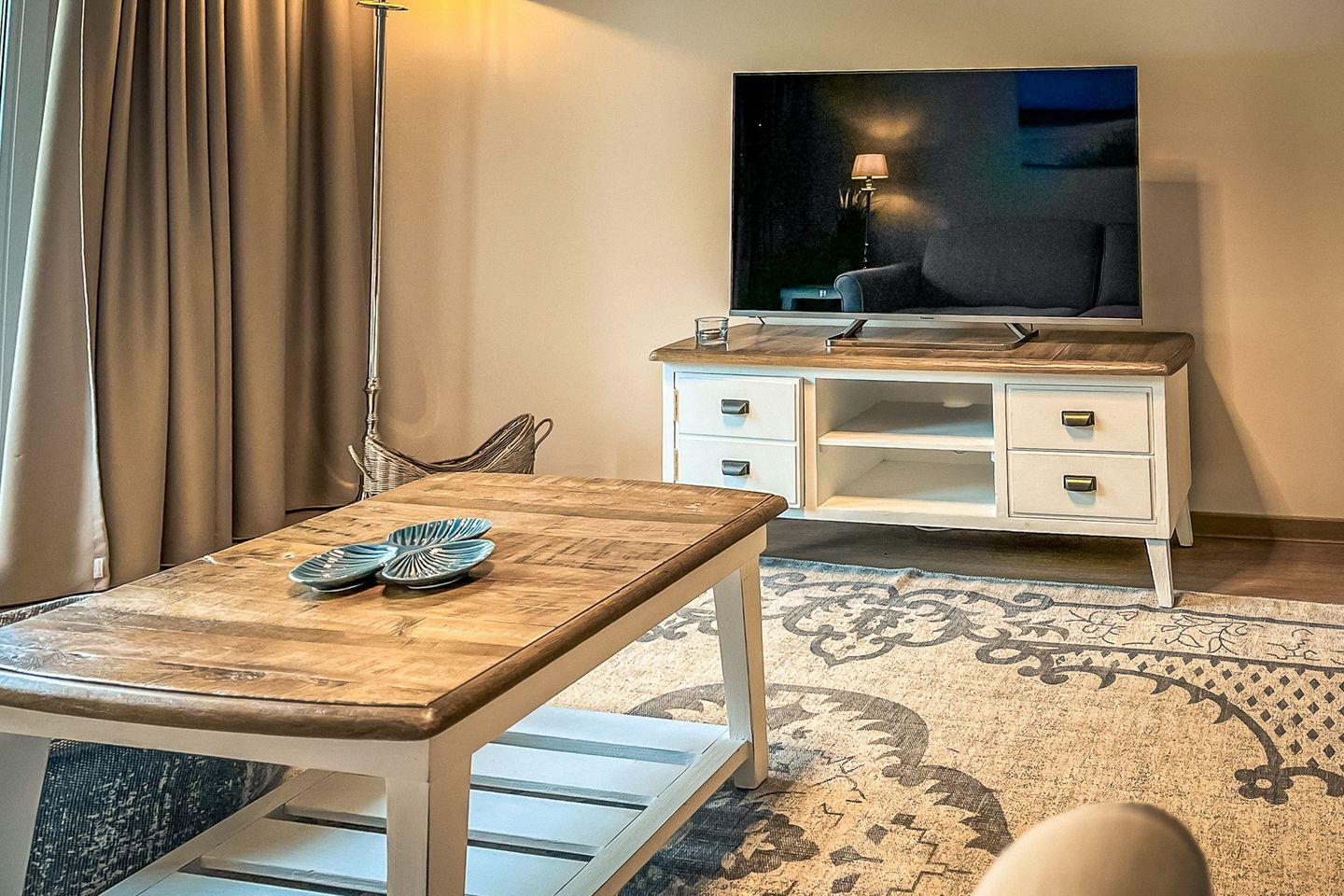 Der offene Wohnbereich ist mit einem gemütlichen Sofa, einem modernen Flachbild-TV sowie einem Essbereich für drei Personen ausgestattet – perfekt für entspannte Urlaubstage.