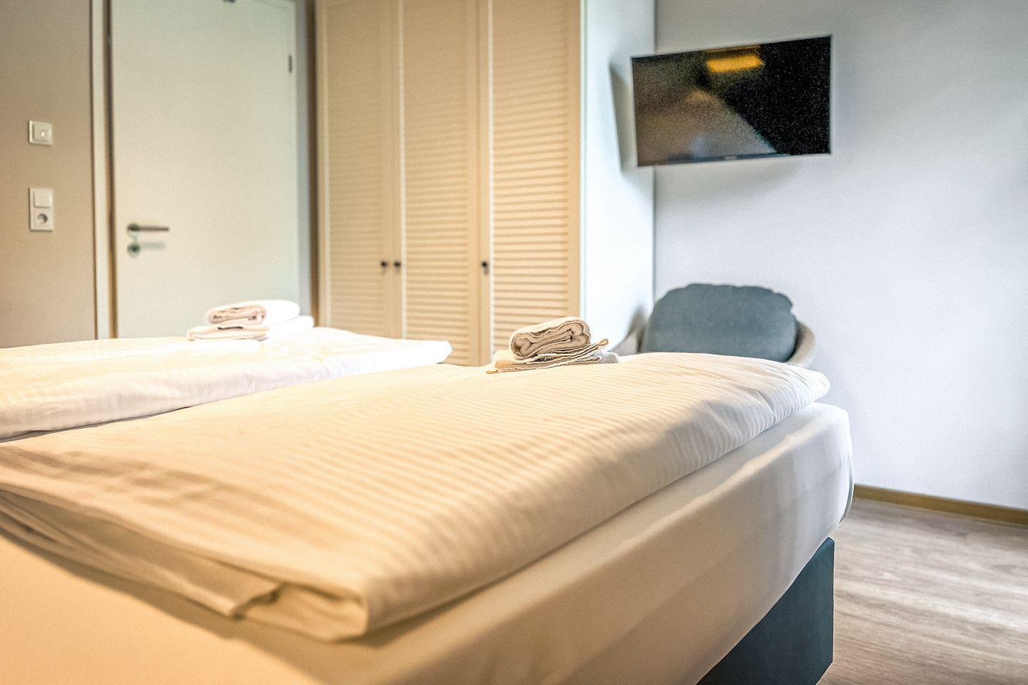 Im separaten Schlafzimmer befindet sich ein komfortables Doppelbett (2x 90x200?cm) sowie ein zusätzlicher Fernseher – für gemütliche Abende auch im Bett.