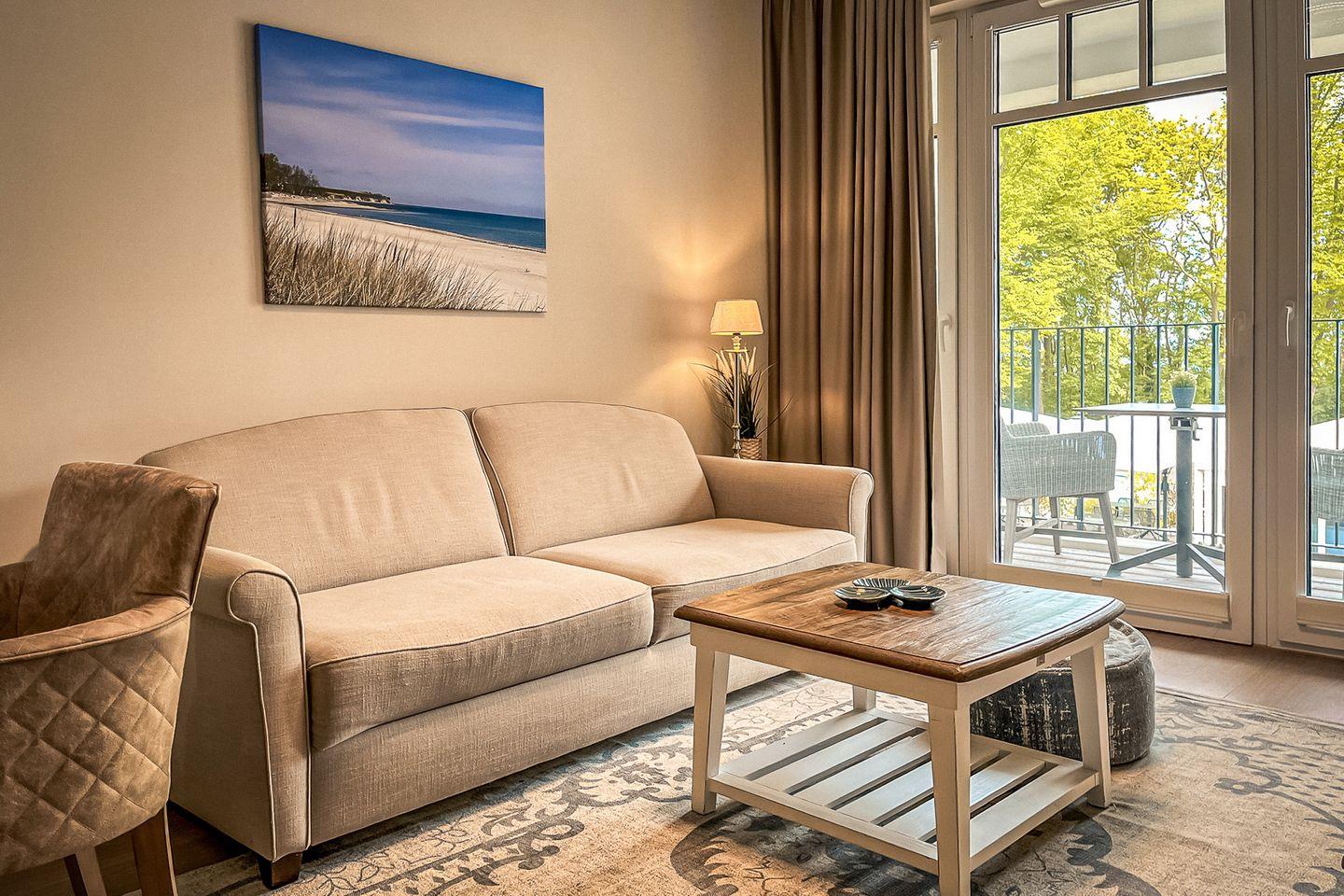 Das geschmackvoll eingerichtete Apartment im 1. Stock bietet ca. 48 m² Wohnfläche, überzeugt mit klarer Raumstruktur und einem angenehmen Meerblick – ideal für Paare oder Alleinreisende sowie für Familien mit Kindern, die Komfort und die Nähe zur Ostsee schätzen.