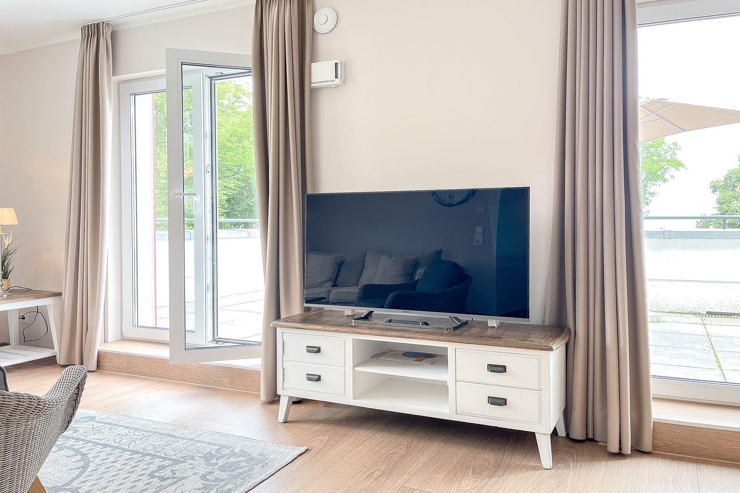 Im offenen Wohnbereich laden ein bequemes Sofa und ein moderner Flachbild-TV zum Entspannen ein. Der angrenzende Essplatz bietet Platz für vier Personen.