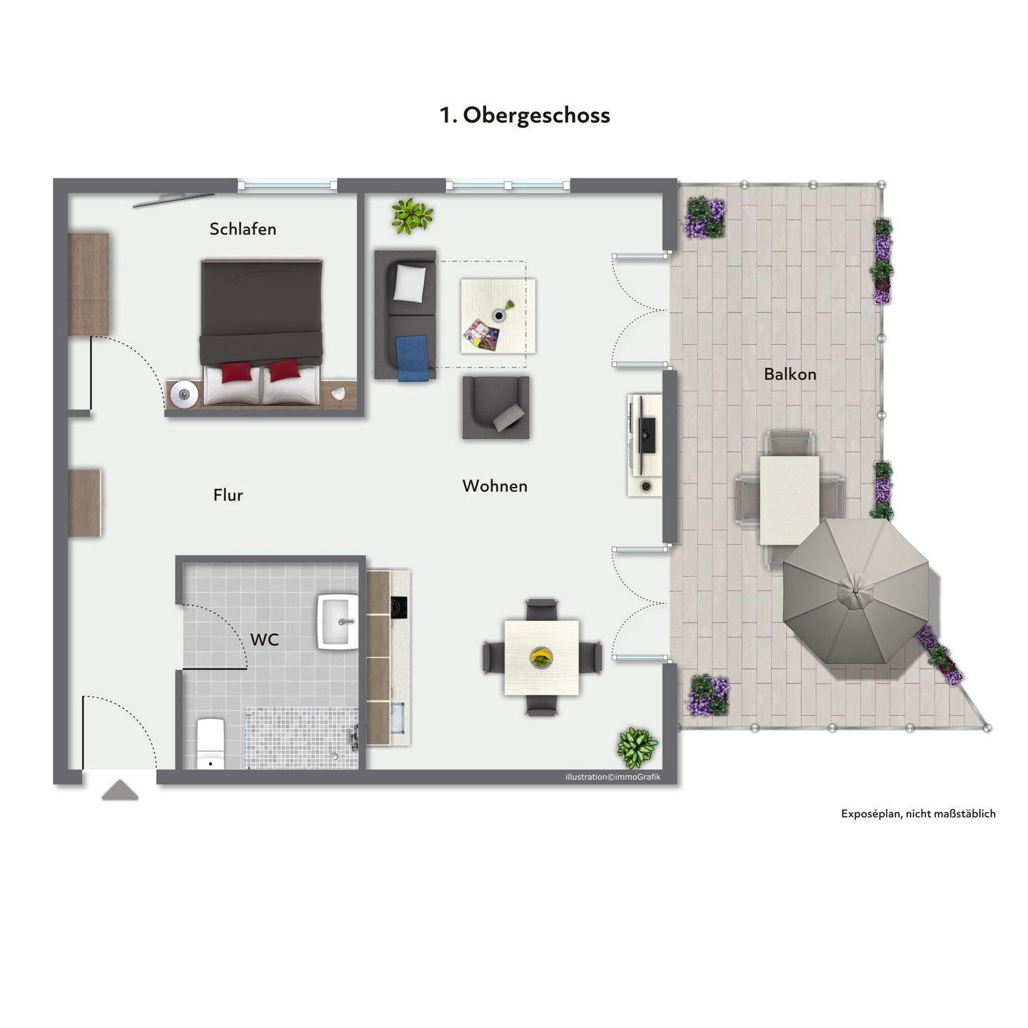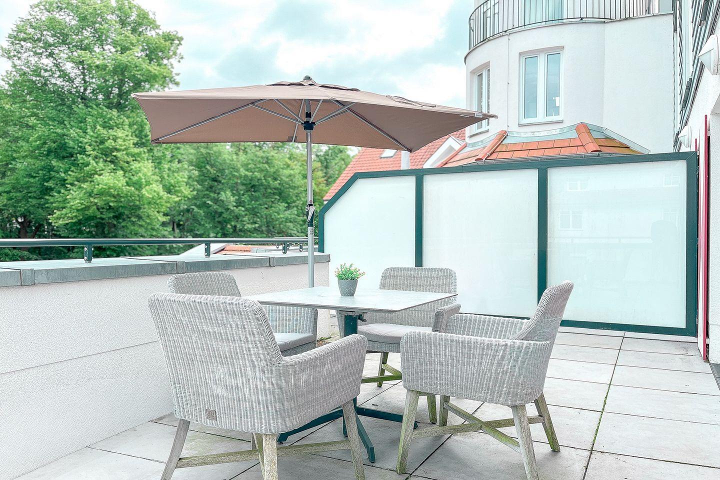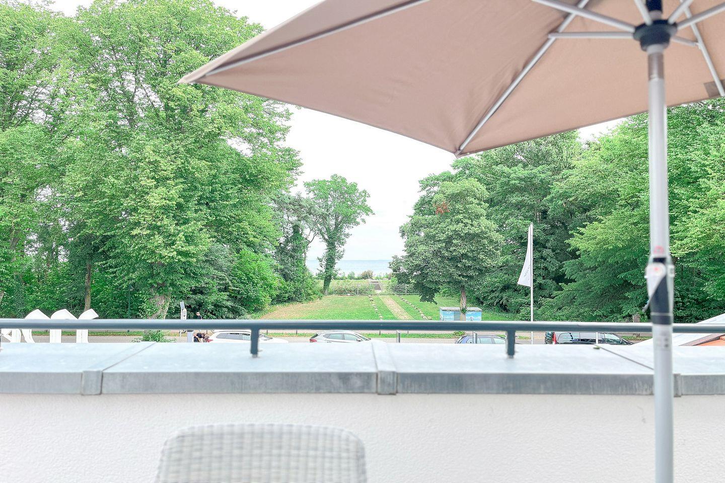 Ein Balkon mit Gartenmöbeln und Sonnenschirm lädt zum Verweilen im Freien ein – perfekt für ein Frühstück in der Morgensonne oder entspannte Abendstunden mir Meerblick.
