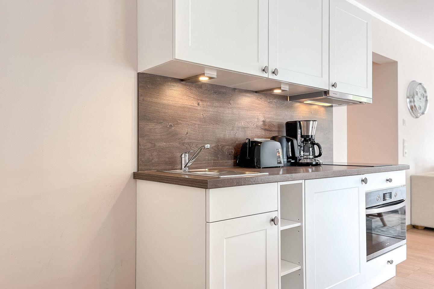 Die integrierte Küche ist mit allem ausgestattet, was Du für Deinen Aufenthalt benötigst: Cerankochfeld, Backofen, Kühlschrank mit Gefrierfach, Kaffeemaschine, Wasserkocher, Toaster sowie Kochutensilien und Geschirr.