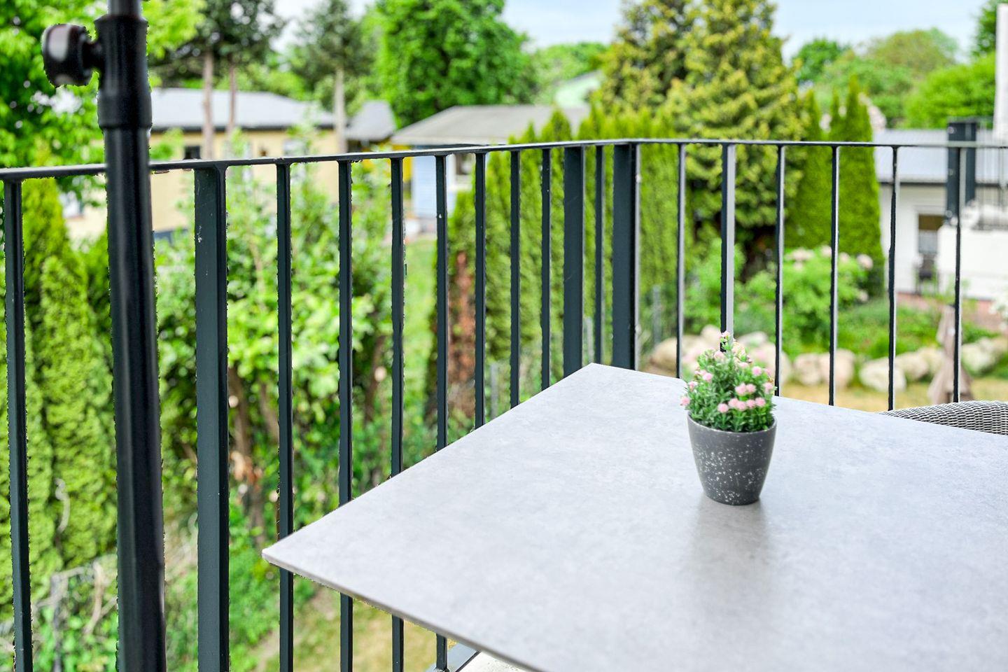 Ein möblierter Balkon mit Sonnenschirm lädt zu entspannten Momenten im Freien ein – sei es bei einer Tasse Kaffee am Morgen oder beim Lesen am Nachmittag.