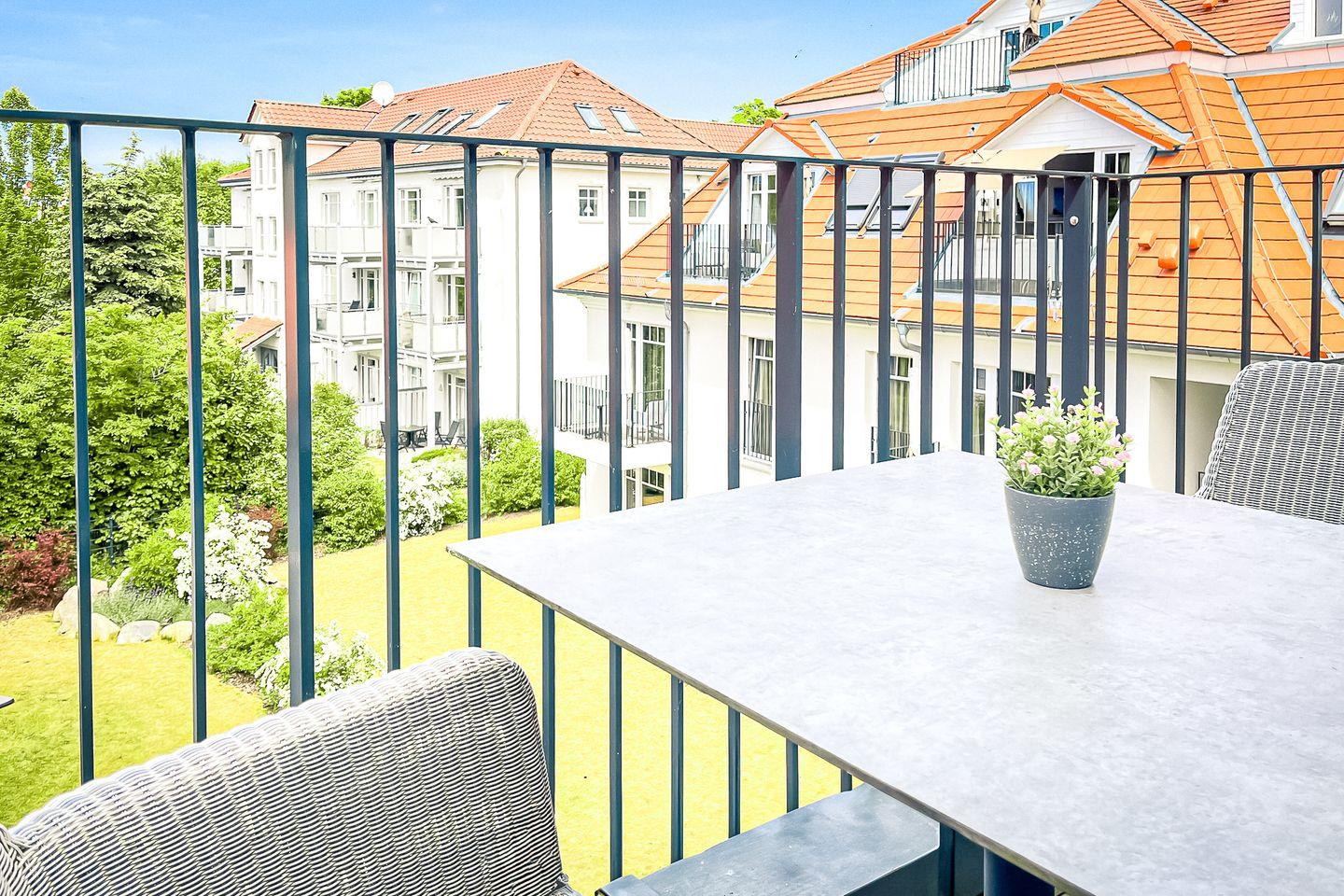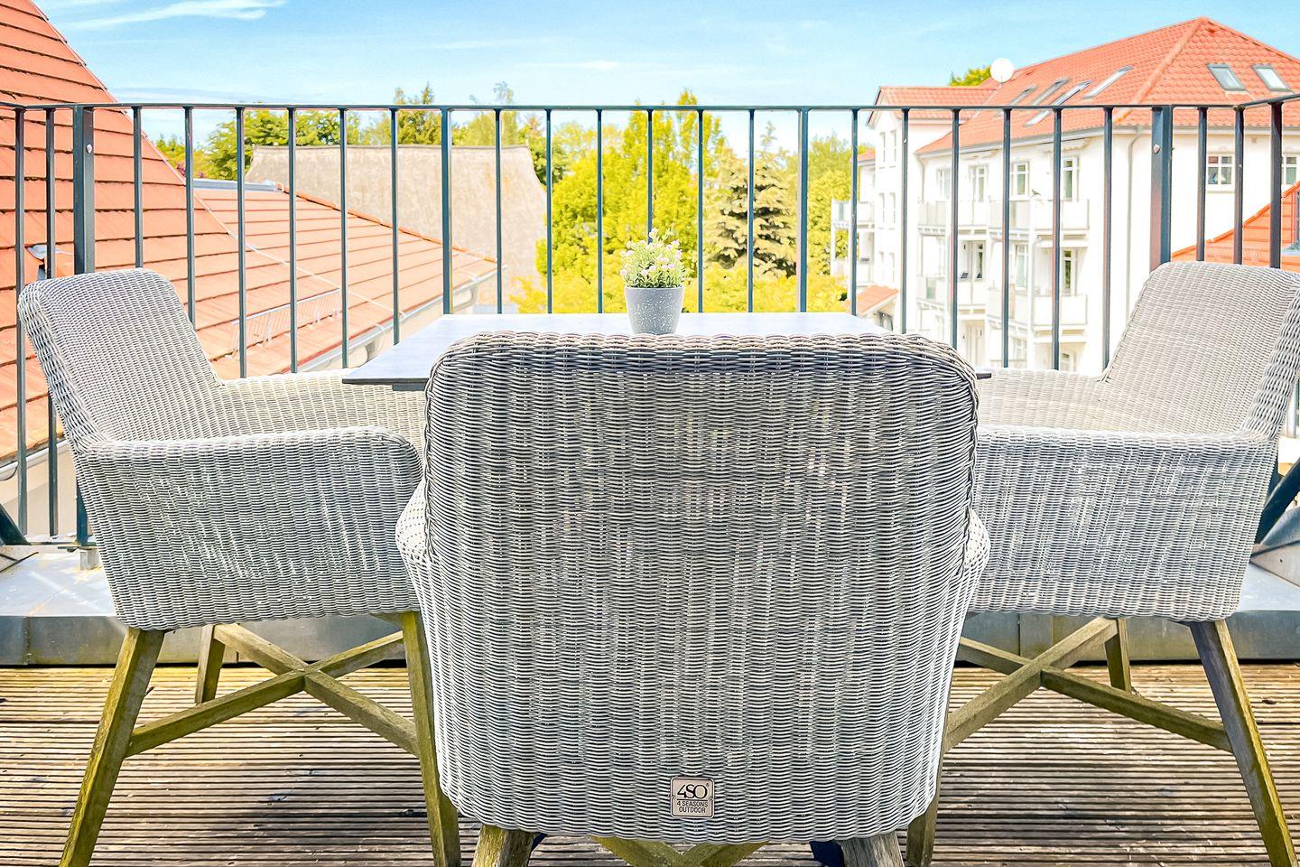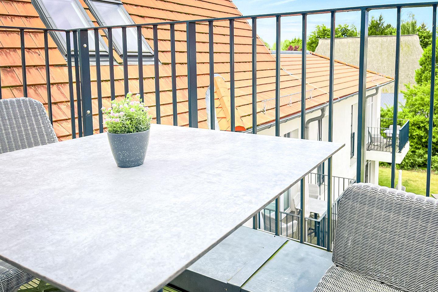 Auf dem Balkon mit Gartenmöbeln kannst Du die Ostseeluft in vollen Zügen genießen – ideal für ein Frühstück im Freien oder einen entspannten Tagesausklang.