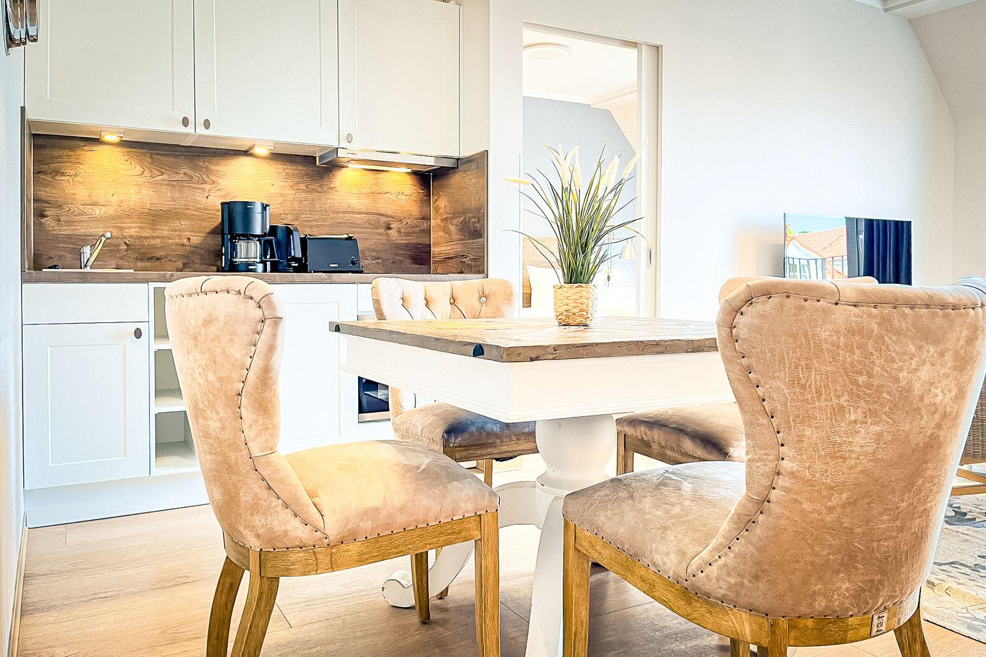 Die offene Küche ist in den Wohnbereich integriert und bietet alles, was Du für einen sorgenfreien Aufenthalt brauchst: Cerankochfeld, Backofen, Kühlschrank mit Gefrierfach, Kaffeemaschine, Wasserkocher, Toaster sowie umfangreiches Koch- und Essgeschirr.