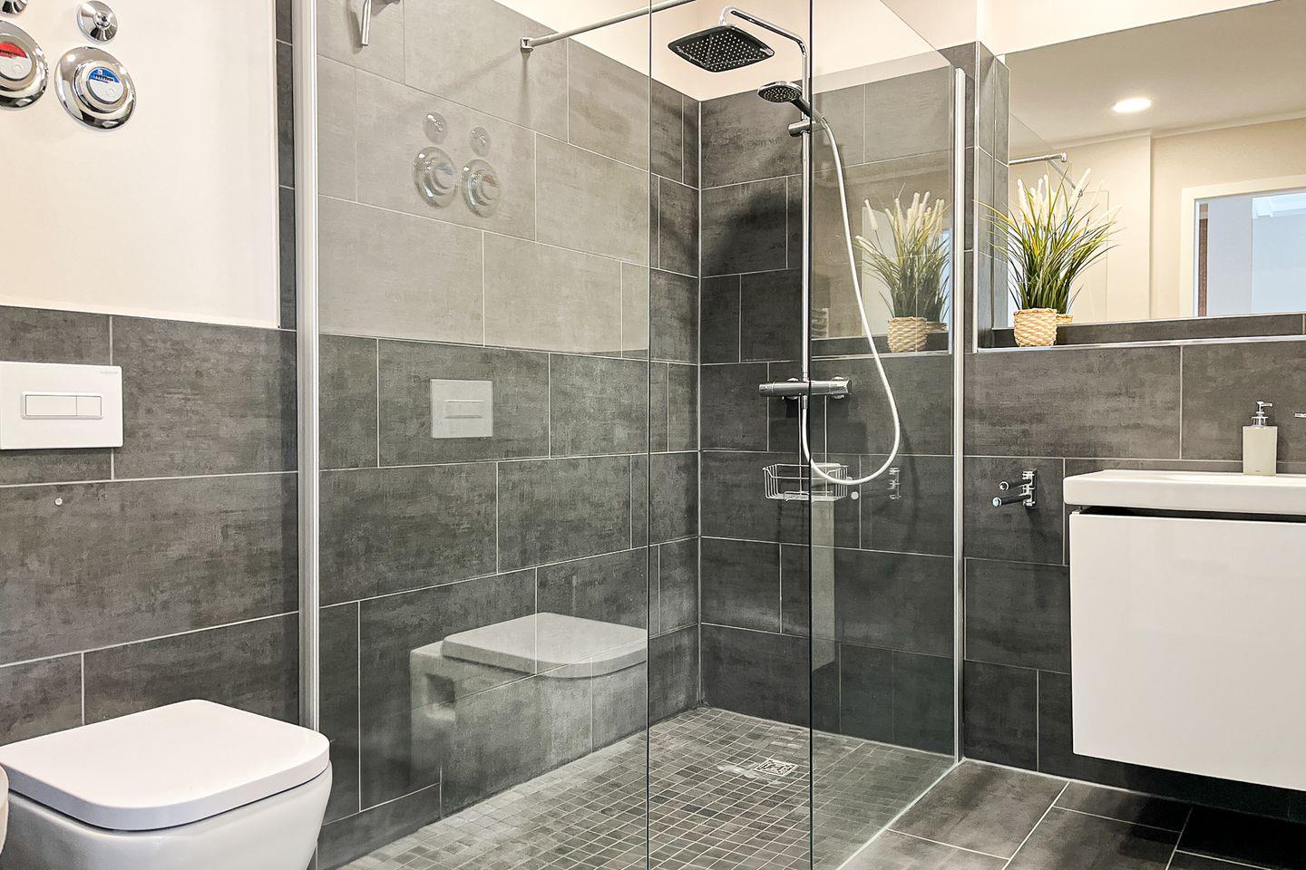Das moderne Badezimmer ist mit einer bodengleichen Dusche, WC, Waschbecken, Kosmetikspiegel und Haartrockner ausgestattet – alles für einen angenehmen Start in den Tag.
