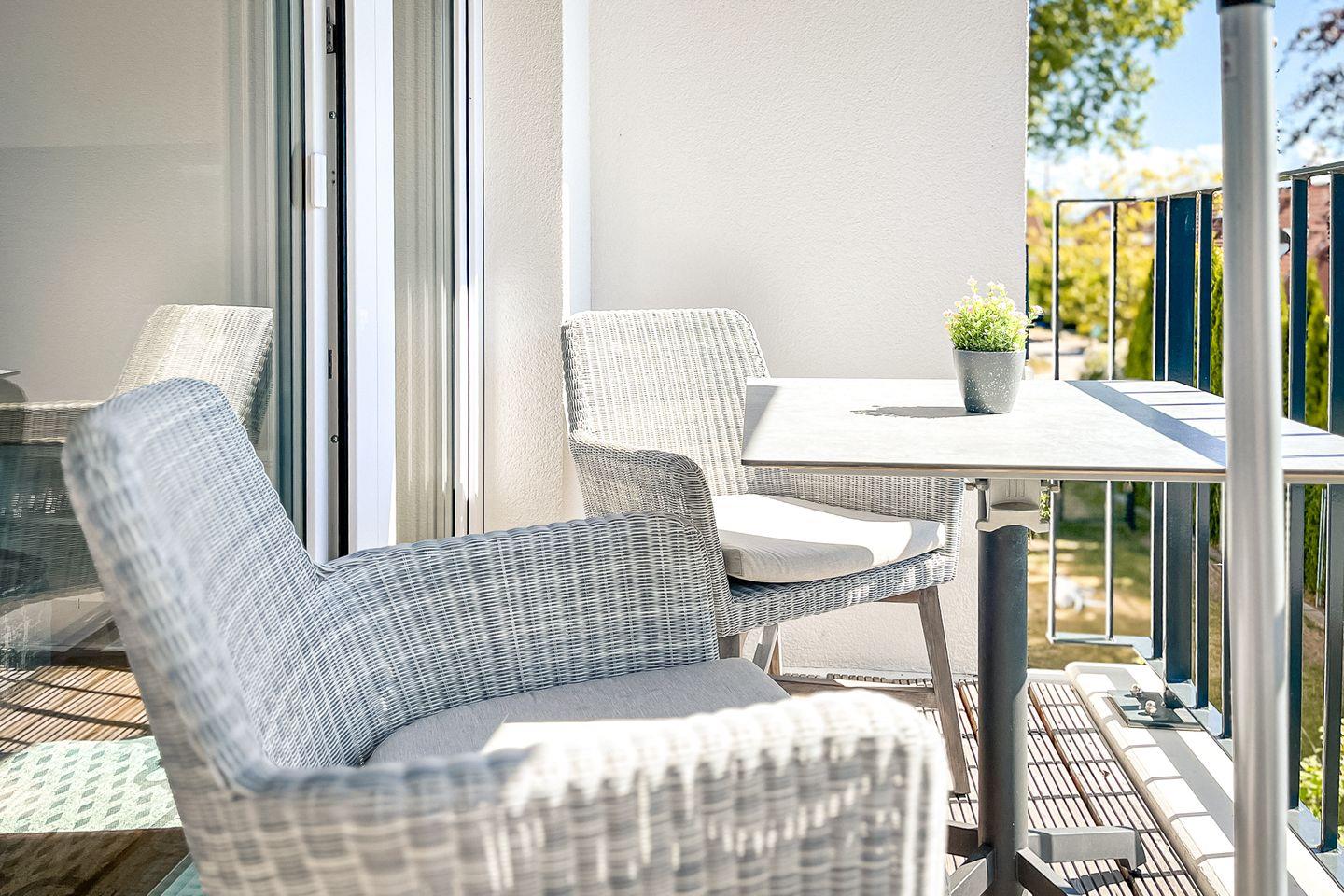 Ein Balkon mit Gartenmöbeln und Sonnenschirm lädt zum Verweilen im Freien ein – perfekt für ein Frühstück in der Morgensonne oder entspannte Abendstunden.