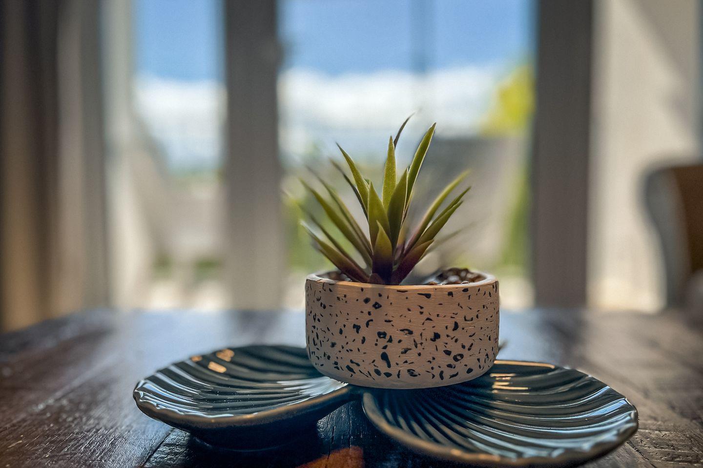 Im offenen Wohnbereich laden ein bequemes Sofa und ein moderner Flachbild-TV zum Entspannen ein. Der angrenzende Essplatz bietet Platz für zwei Personen.