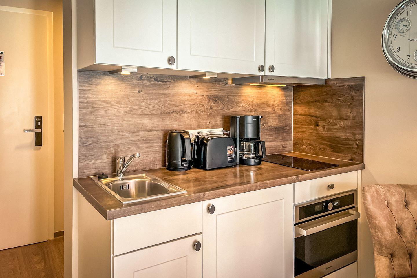 Die kompakte Küche ist offen in den Wohnraum integriert und bietet alles für den täglichen Bedarf: Cerankochfeld, Backofen, Kühlschrank mit Gefrierfach, Kaffeemaschine, Wasserkocher, Toaster sowie ausreichend Koch- und Essgeschirr.