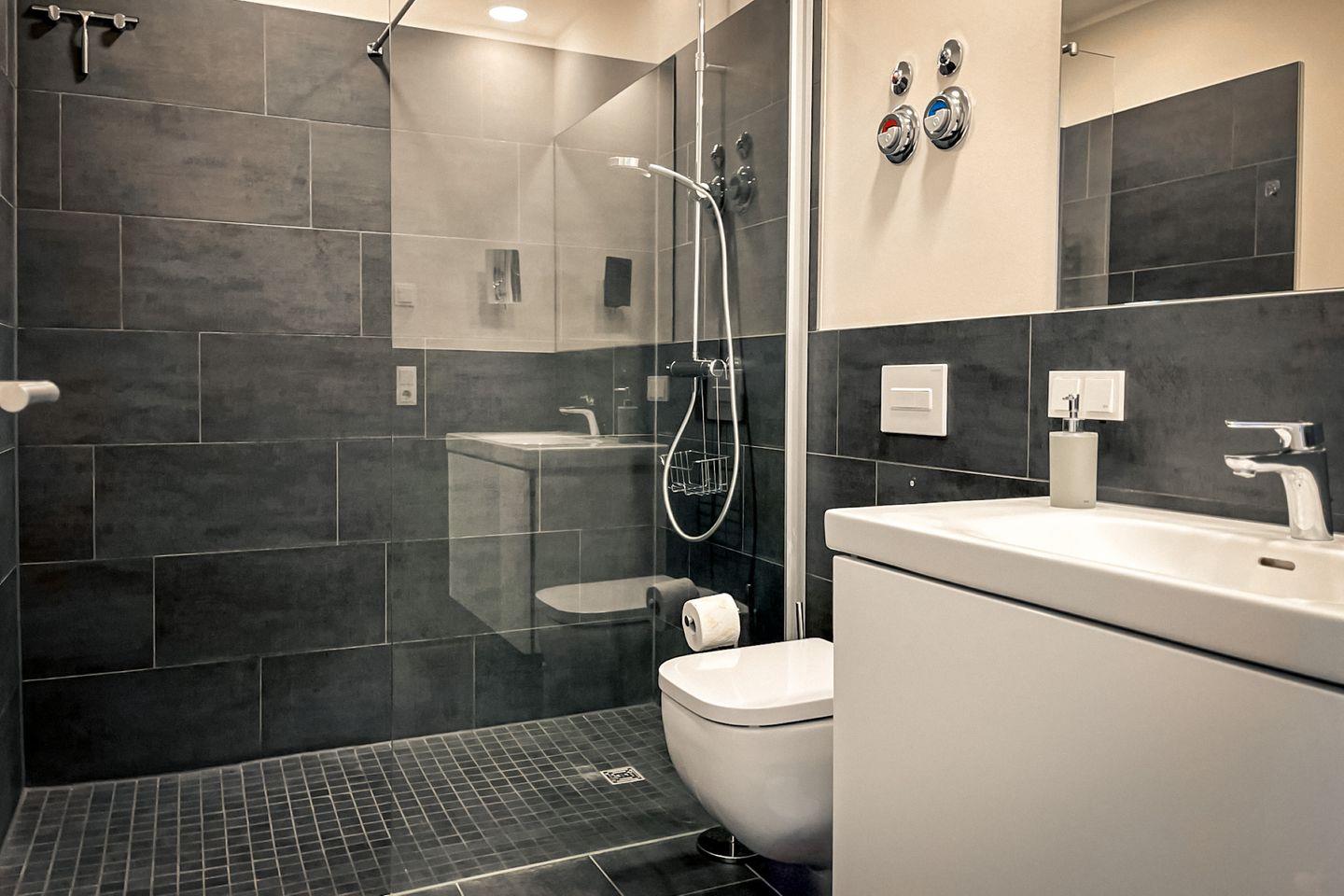Das moderne Badezimmer verfügt über eine bodengleiche Dusche, WC, Waschbecken, Kosmetikspiegel und Haartrockner – funktional und ansprechend zugleich.