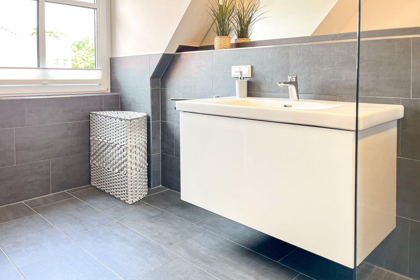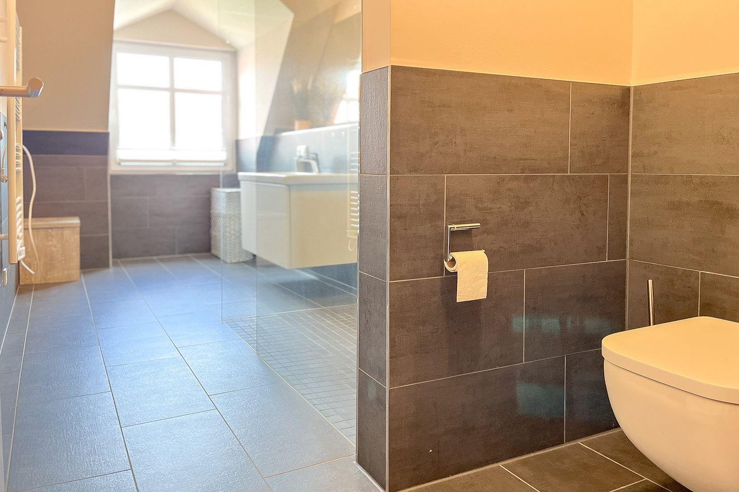 Das moderne Badezimmer bietet eine bodengleiche Dusche, WC, Waschbecken, Kosmetikspiegel und Haartrockner – perfekt für Deinen Start in den Tag.
