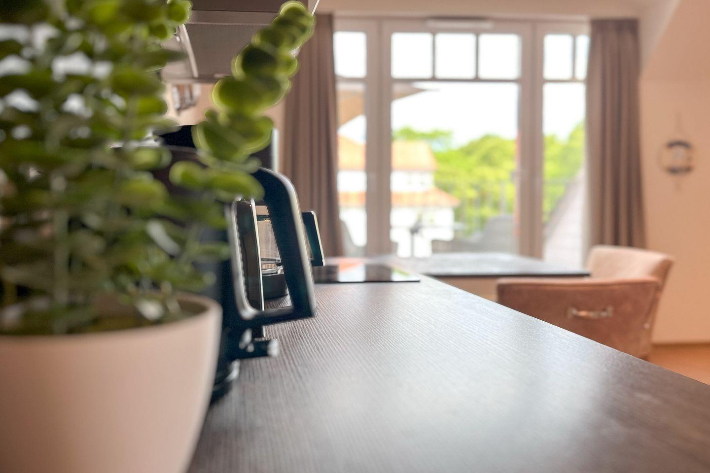 Die offene Küche ist modern und vollständig ausgestattet: Cerankochfeld, Backofen, Kühlschrank mit Gefrierfach, Spülmaschine, Kaffeemaschine, Wasserkocher, Toaster, Küchenutensilien sowie Geschirr und Besteck lassen keine Wünsche offen – ideal für Deine Selbstverpflegung.
