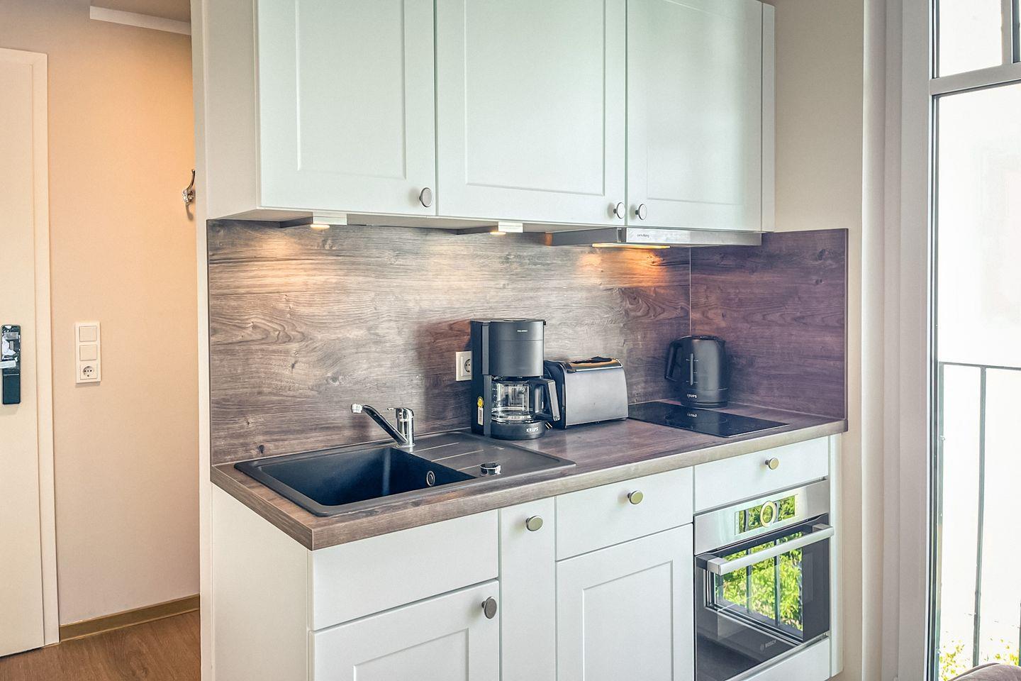 Die moderne Küche ist offen zum Wohnbereich gestaltet und vollständig ausgestattet – unter anderem mit Cerankochfeld, Backofen, Kühlschrank mit Gefrierfach, Spülmaschine, Nespresso-Maschine, Wasserkocher, Toaster sowie allen notwendigen Kochutensilien.