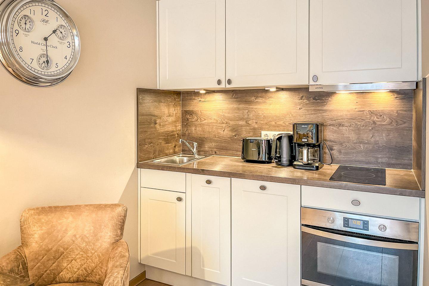 Die offene Küche ist komplett ausgestattet und lässt keine Wünsche offen: Cerankochfeld, Backofen, Kühlschrank mit Gefrierfach, Spülmaschine, Kaffeemaschine, Wasserkocher, Toaster sowie umfangreiches Kochgeschirr und Besteck stehen bereit.