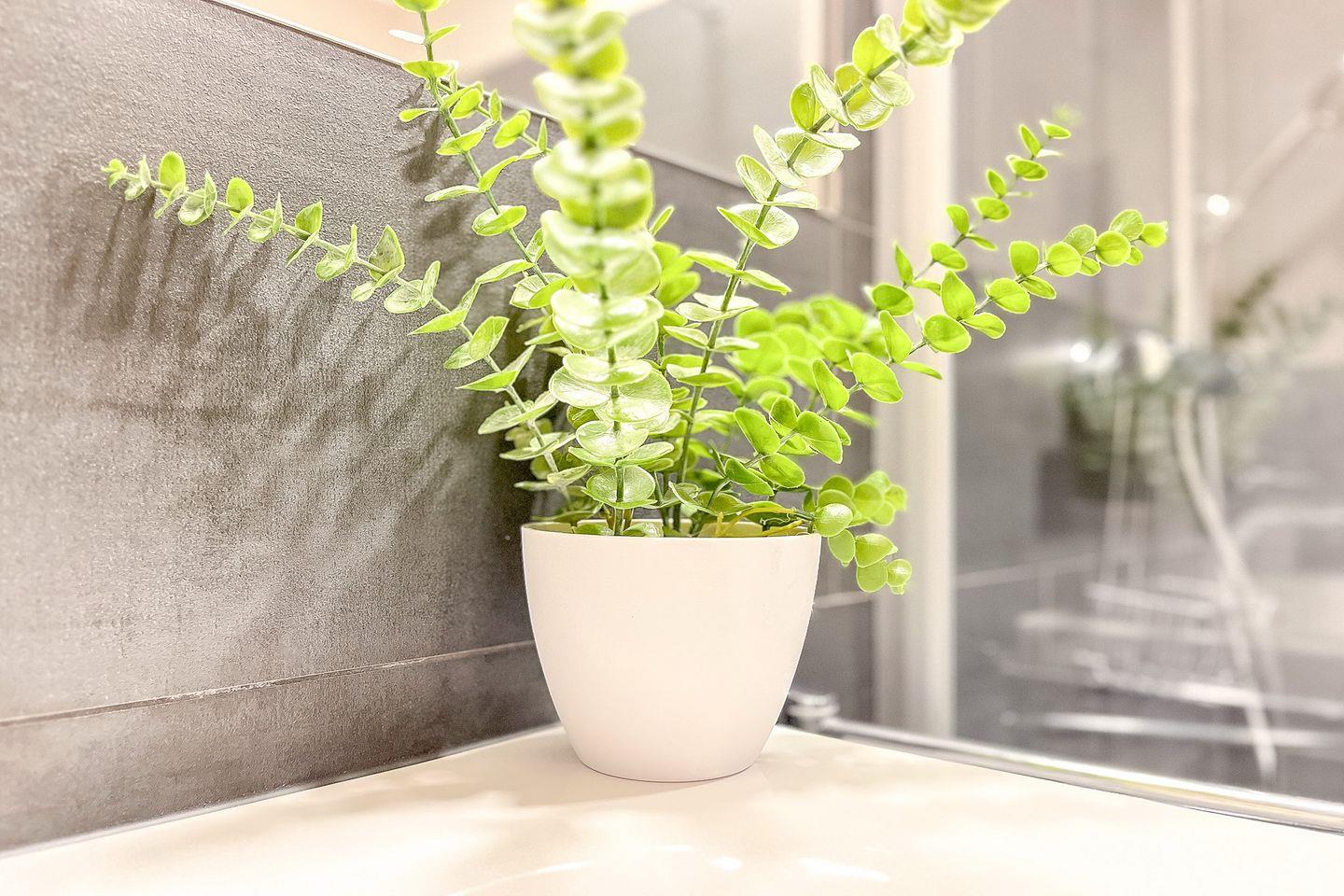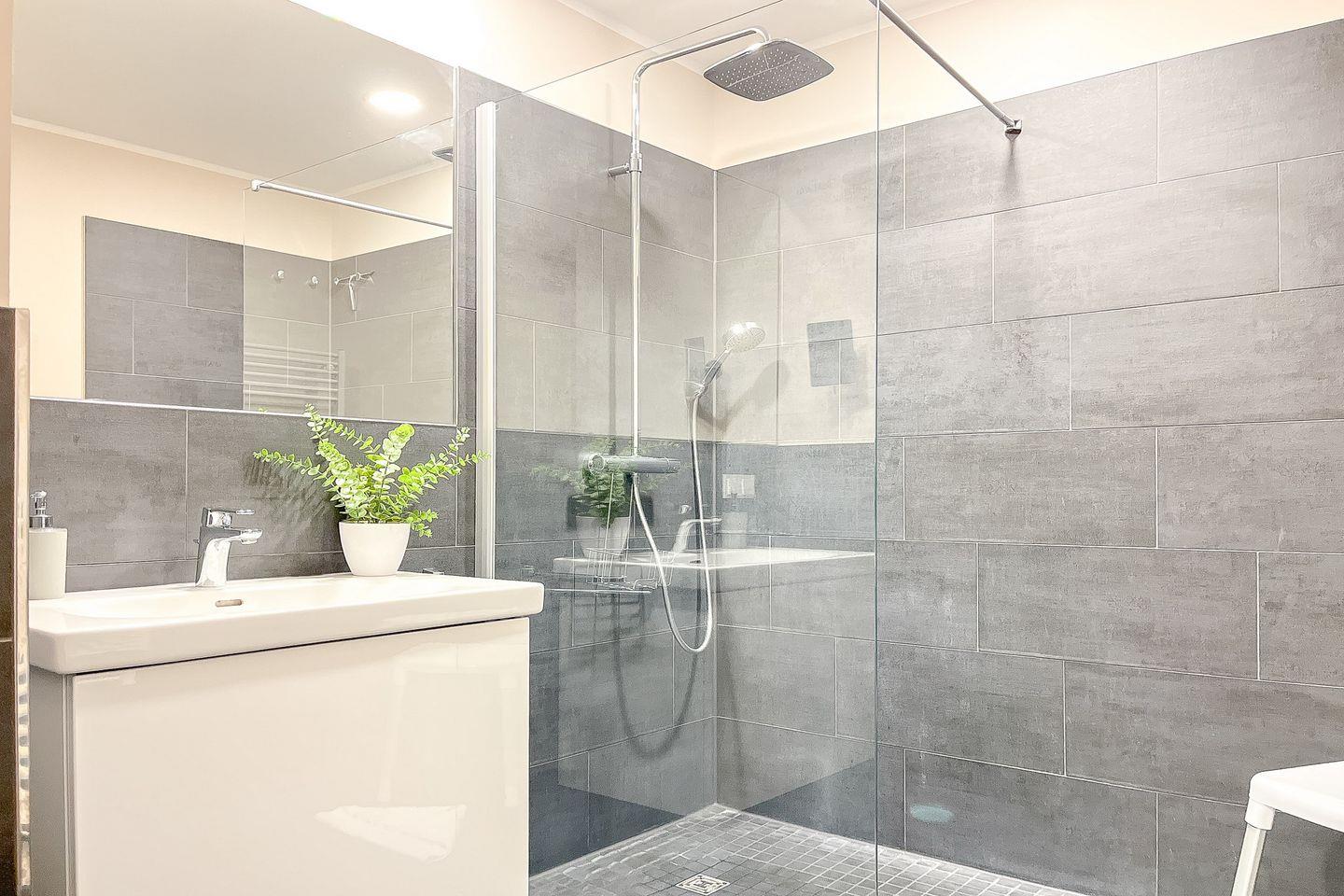 Das moderne Badezimmer verfügt über eine bodengleiche Dusche, WC, Waschbecken, Kosmetikspiegel und Haartrockner – optimal für Deinen Start in den Tag.