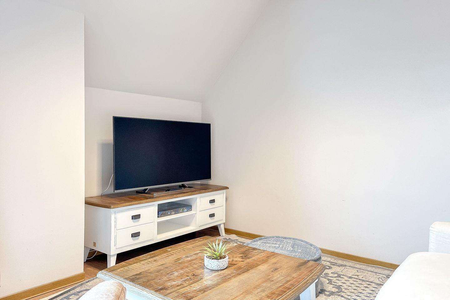 Der helle Wohnbereich hat Verdunkelungsvorhänge und ist mit einem gemütlichen Sofa inkl. Schlaffunktion und Flachbild-TV ausgestattet – perfekt für entspannte Stunden. Der angrenzende Essbereich bietet Platz für drei Personen und ist offen in das Wohnkonzept integriert.