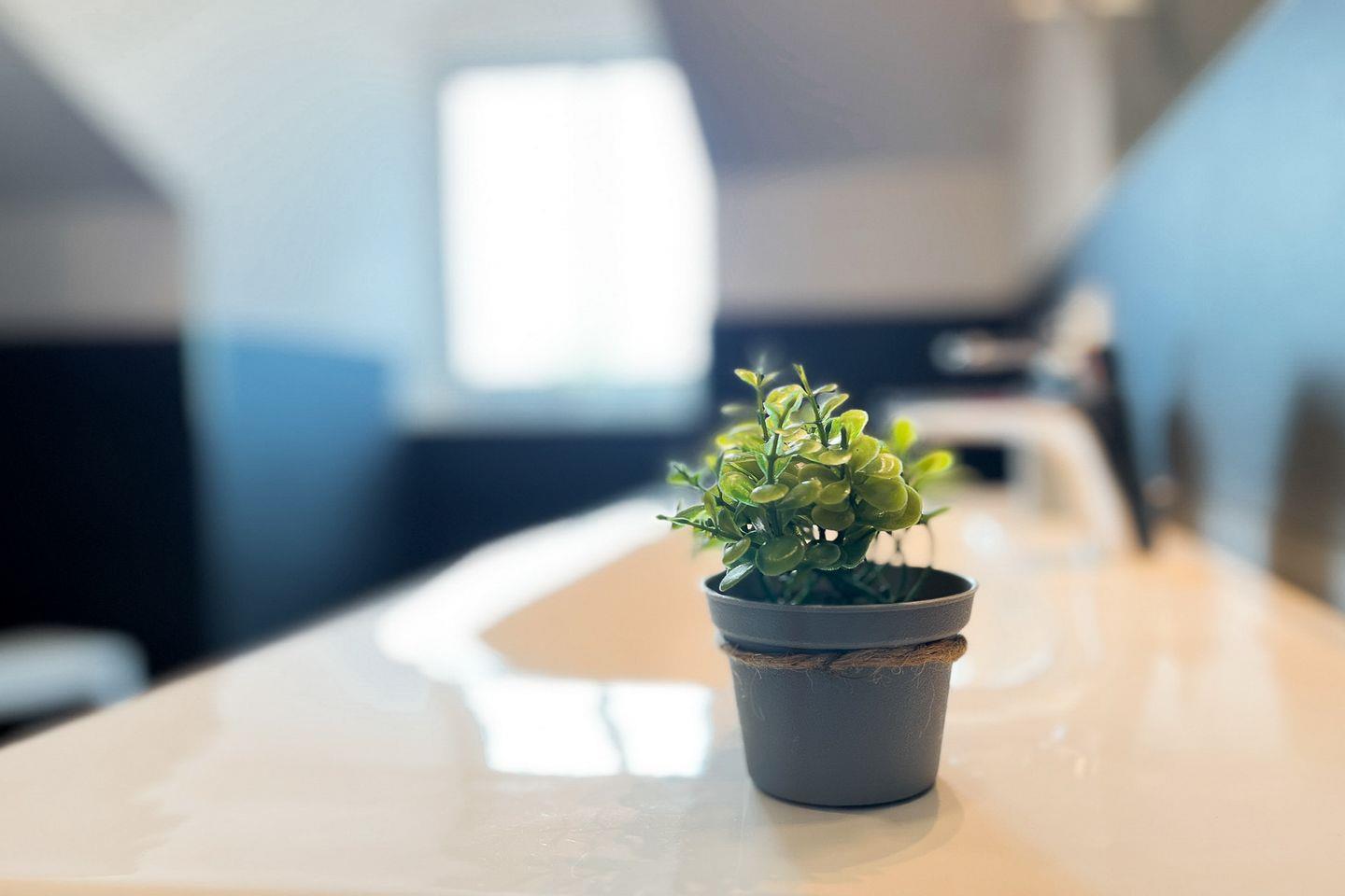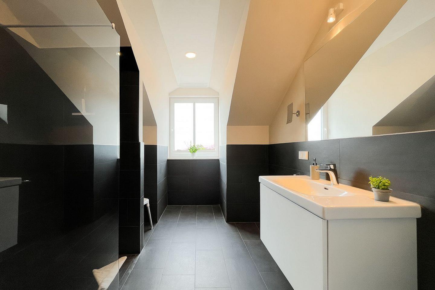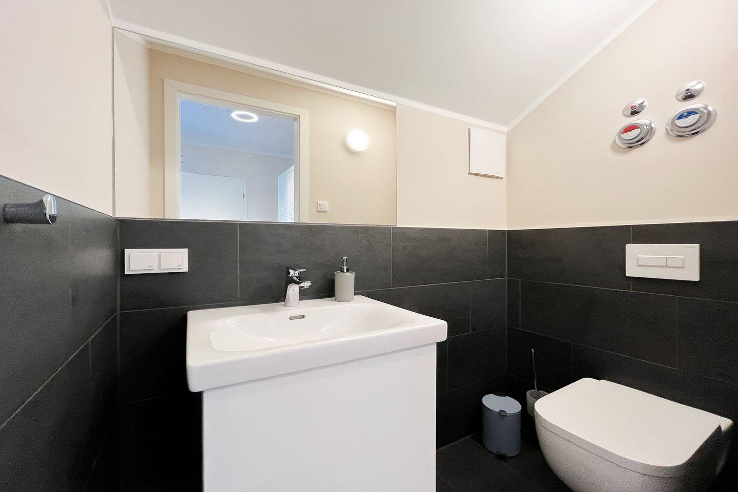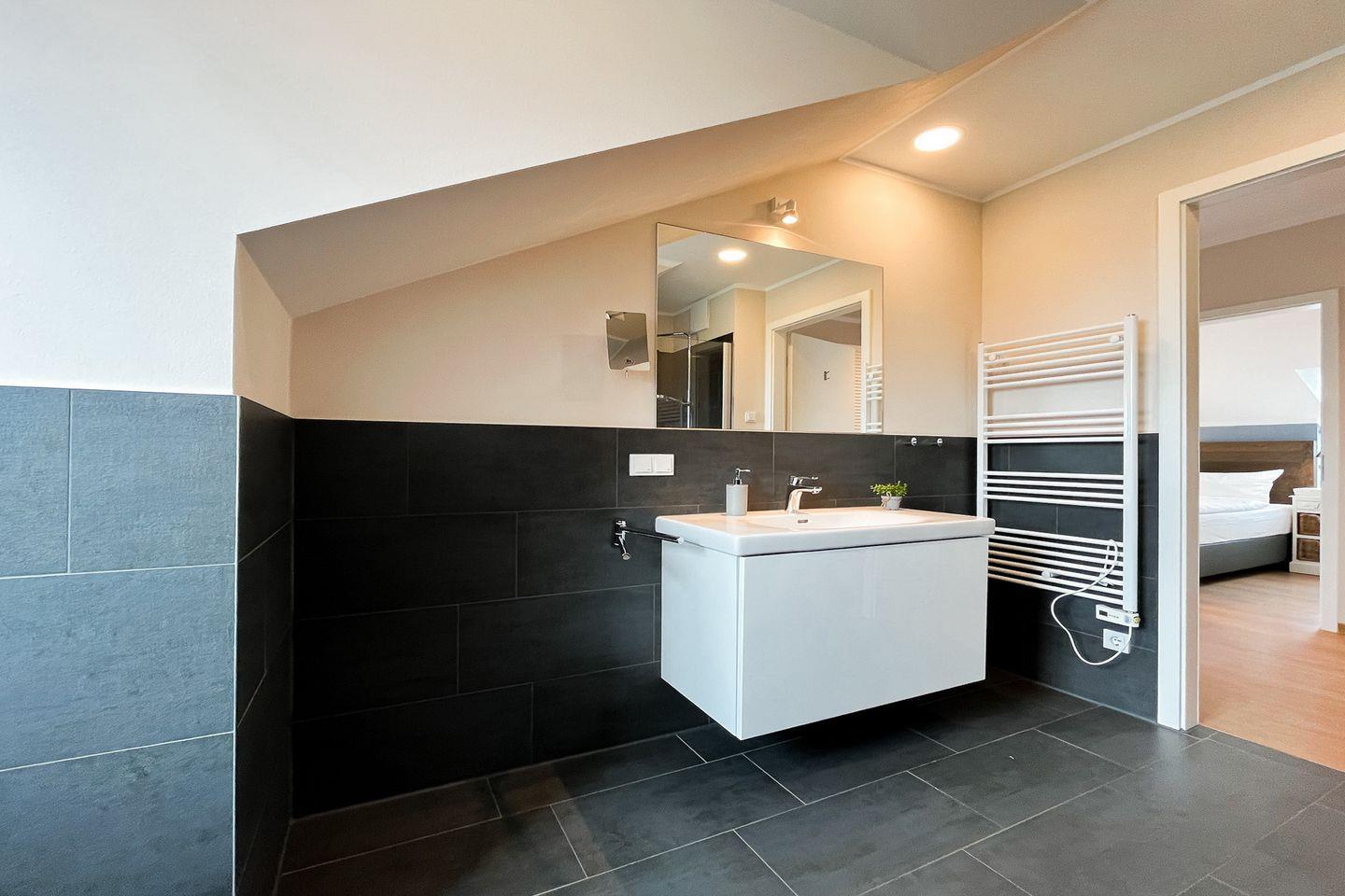 Das moderne Badezimmer bietet eine bodengleiche Dusche, separates WC, Waschbecken, Kosmetikspiegel, Haartrockner, Badehocker und Wäscheständer – perfekt für Deinen Start in den Tag.