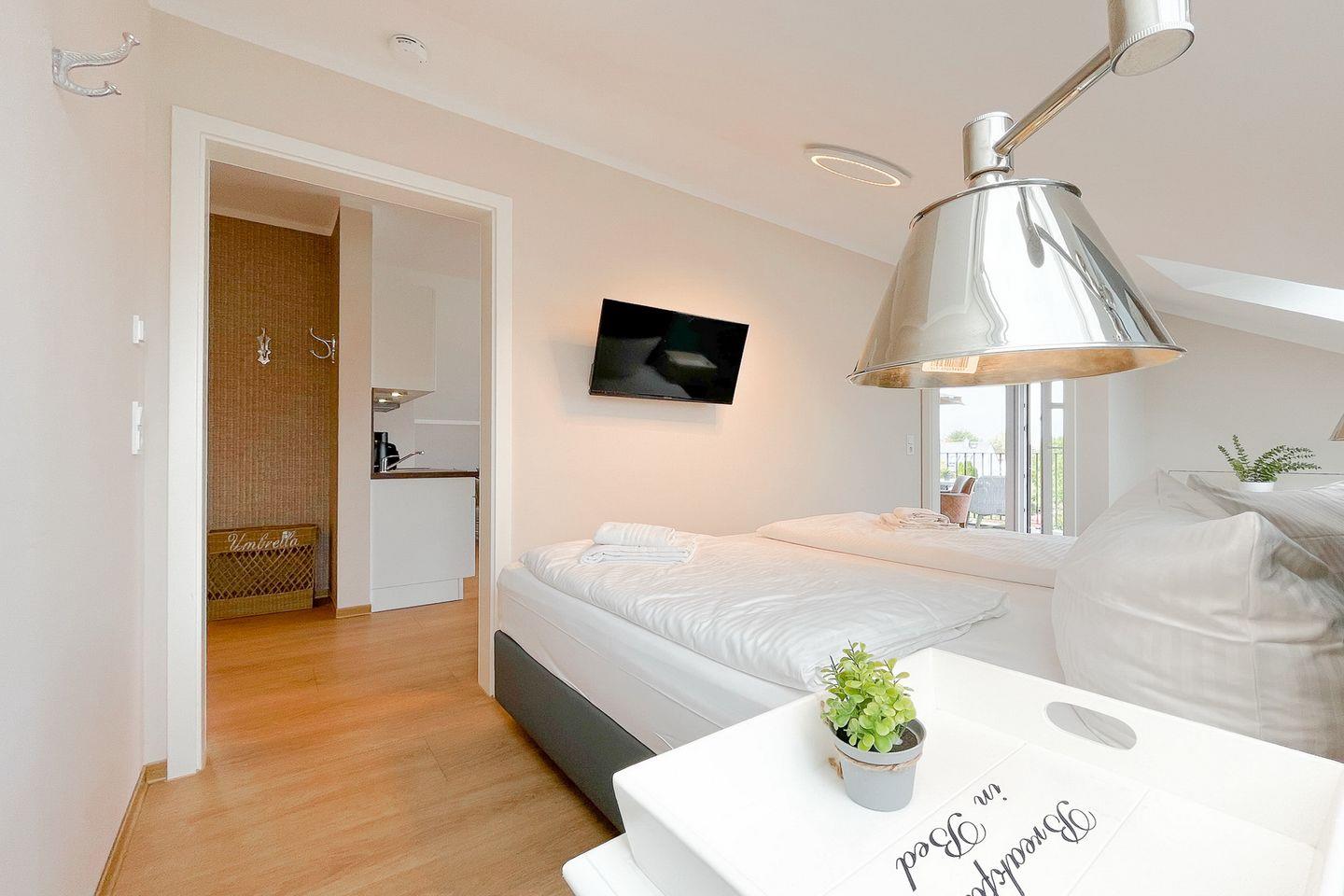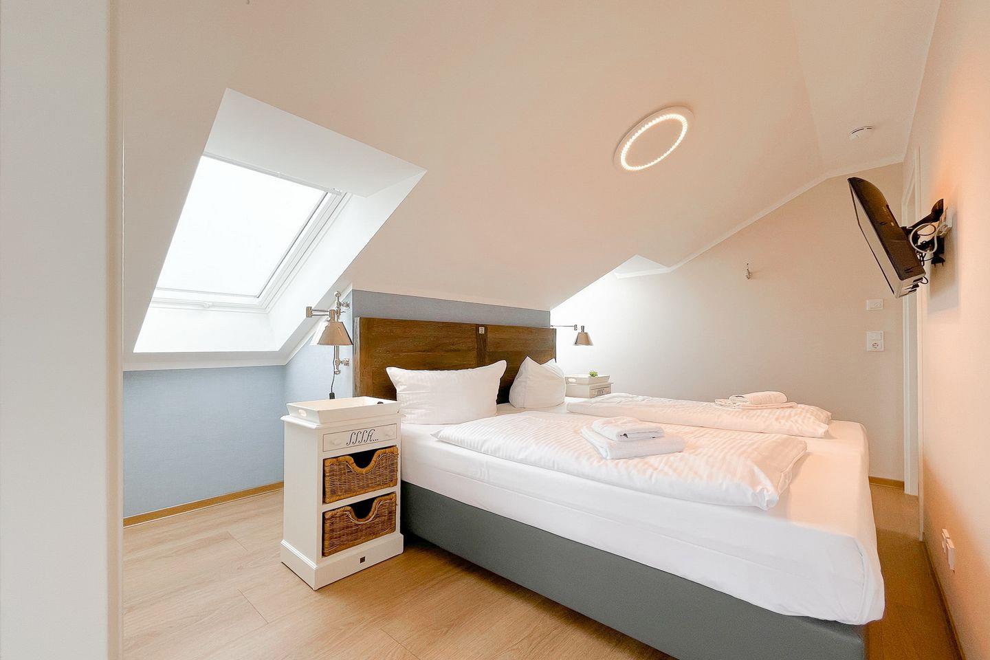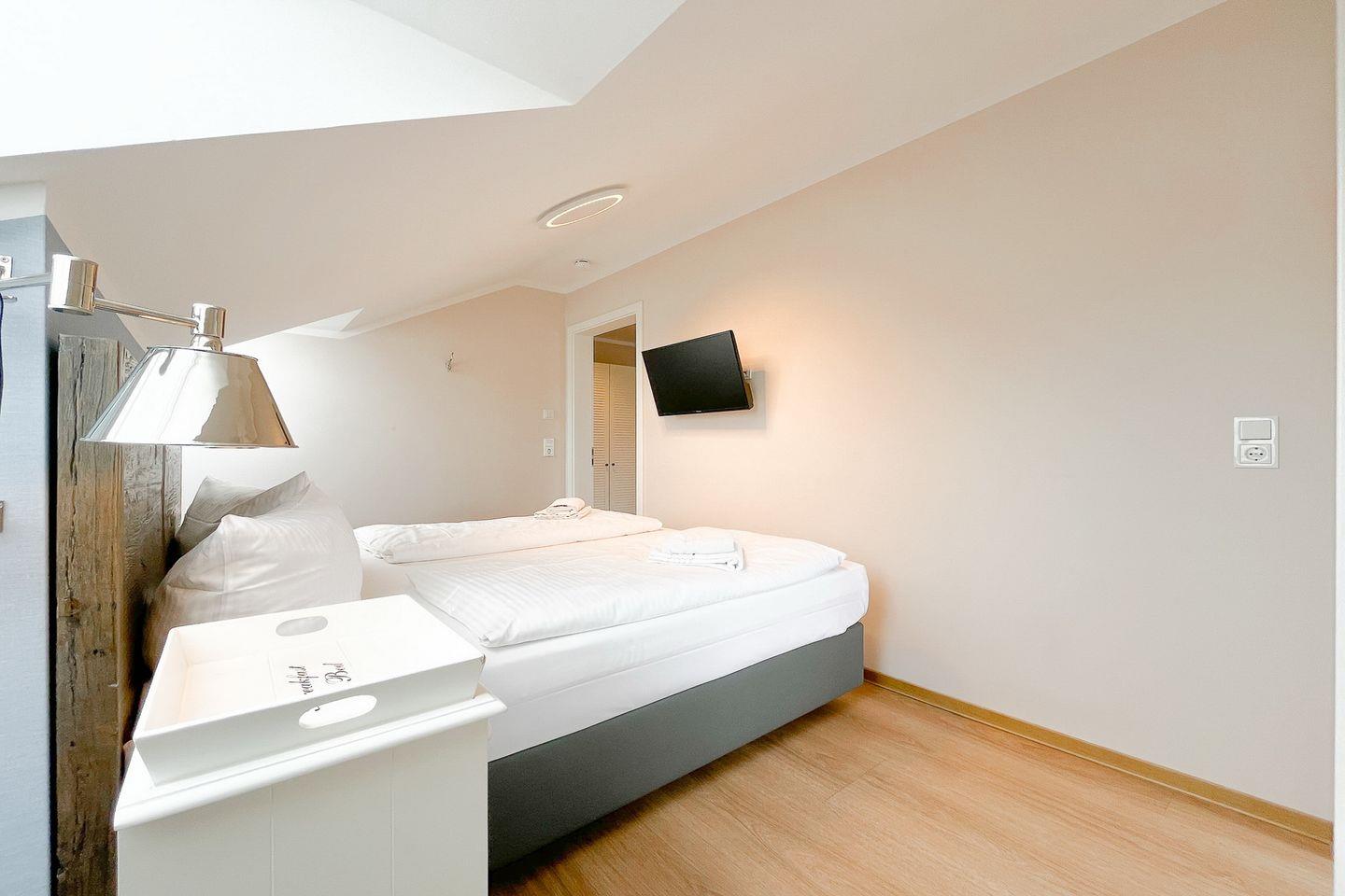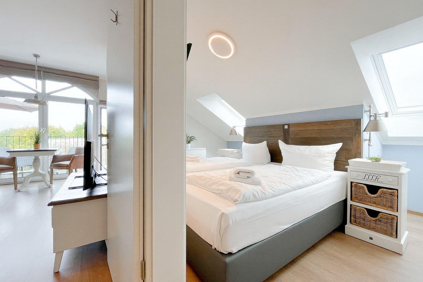 Im separaten Schlafzimmer findest Du ein komfortables Doppelbett (2x 90x200?cm) für erholsame Nächte, sowie einen zusätzlichen Fernseher und eine Kommode für Ihre Urlaubsgarderobe.
